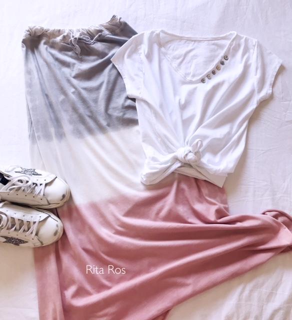 Falda larga de cintura elástica con efecto Tie Dye. Combínala con nuestra camiseta básica botones y tendrás un look perfecto.