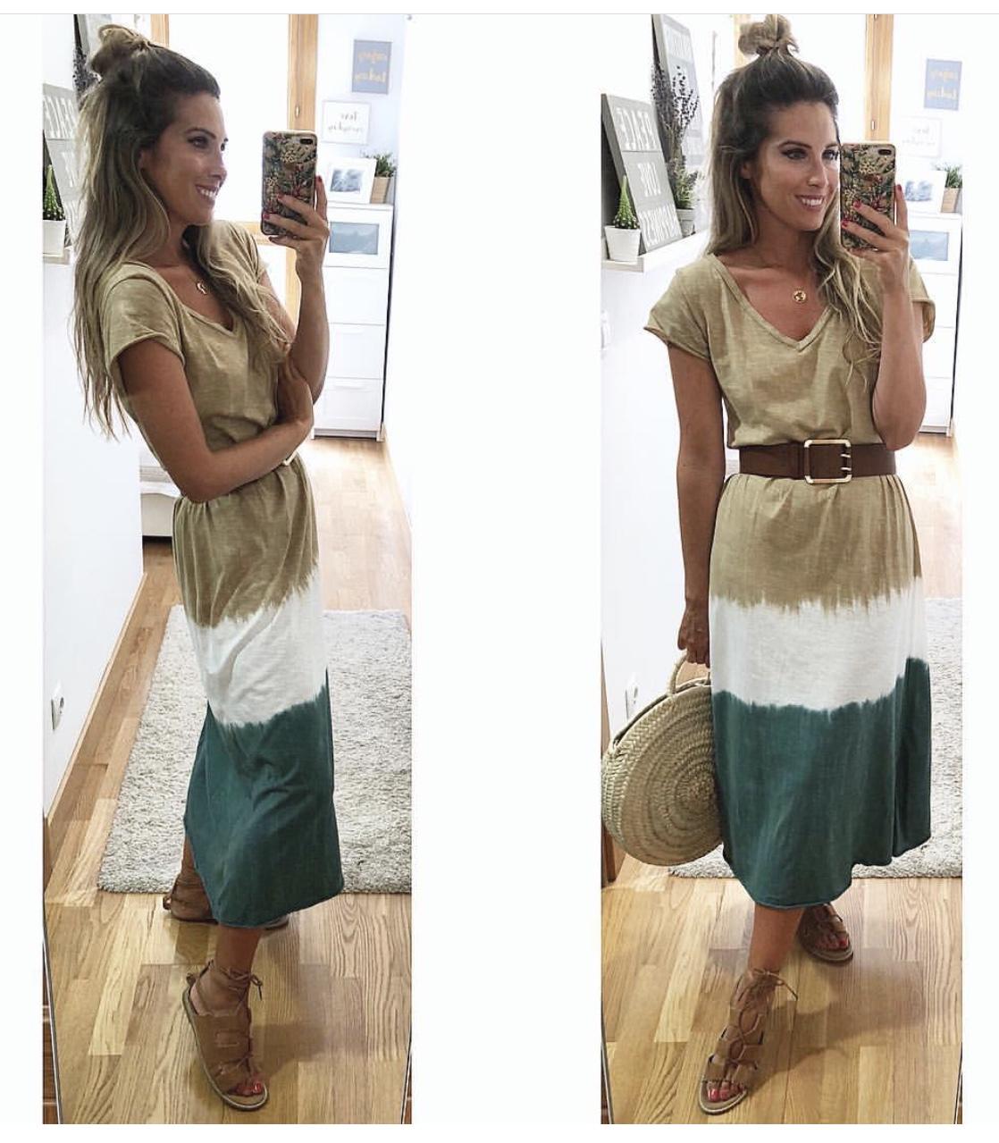 Vestido largo de manga corta y escote pico con estampado Tie Dye. Un vestido muy cómodo con unos colores preciosos.