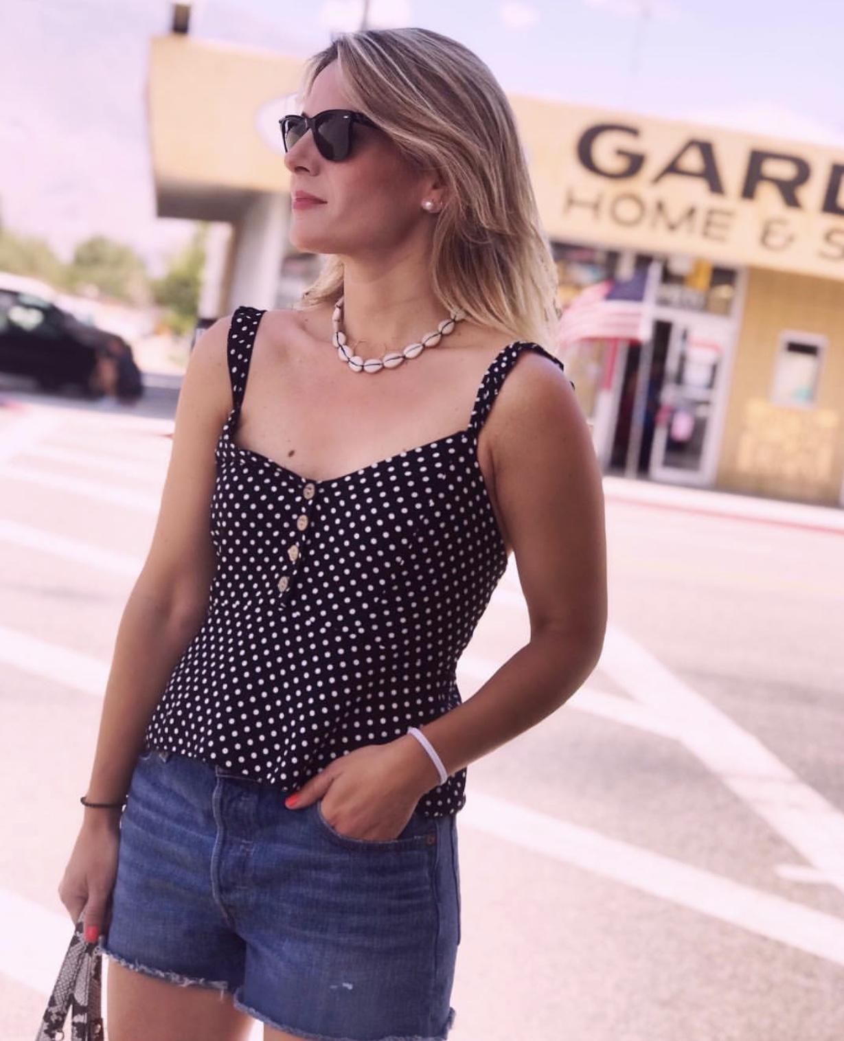 Una monada de blusa fruncida en la espalda con corte acampanado debajo del pecho y botones de madera.