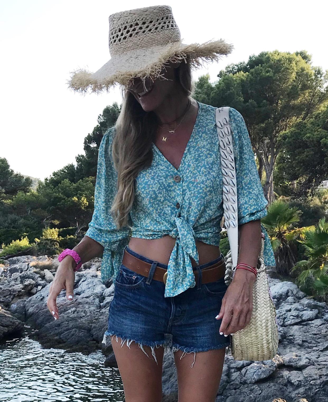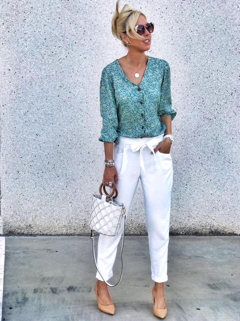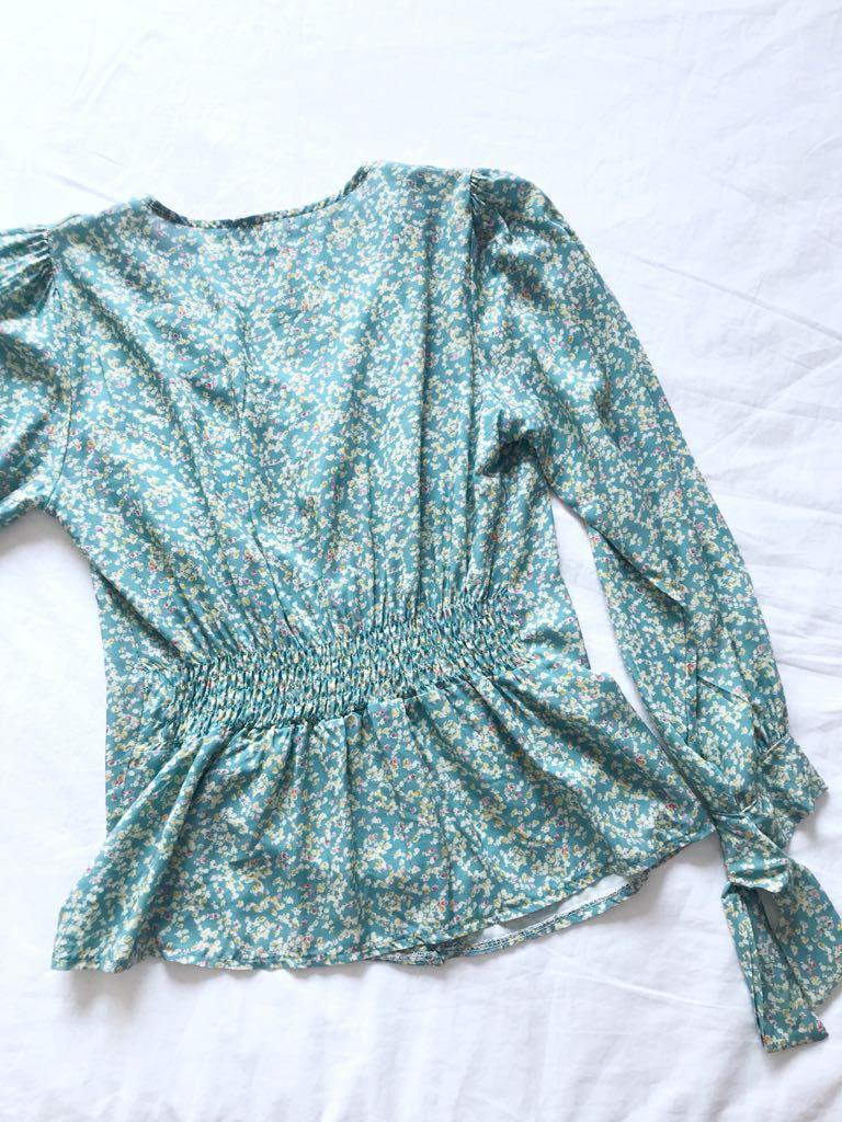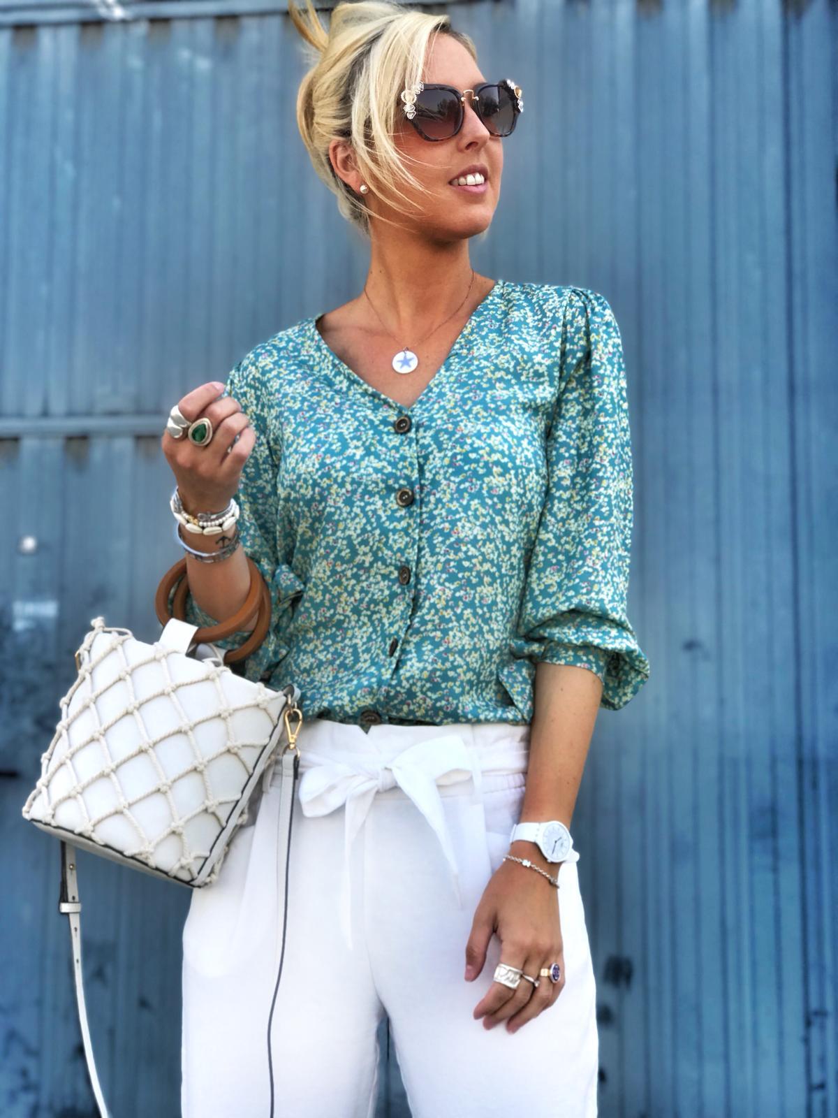 Blusa de tejido viscosa estampada de florecitas, manga larga, escote en pico y abotonada por delante con detalle botones de madera.