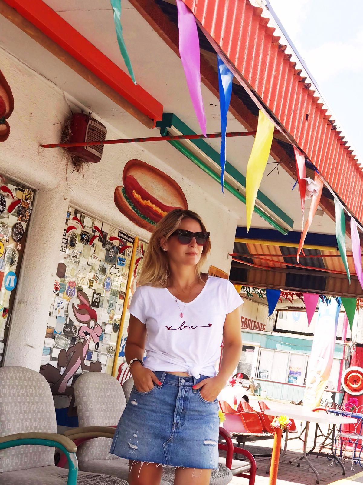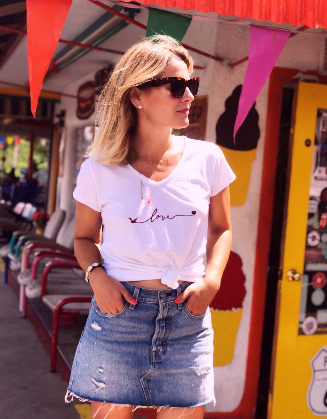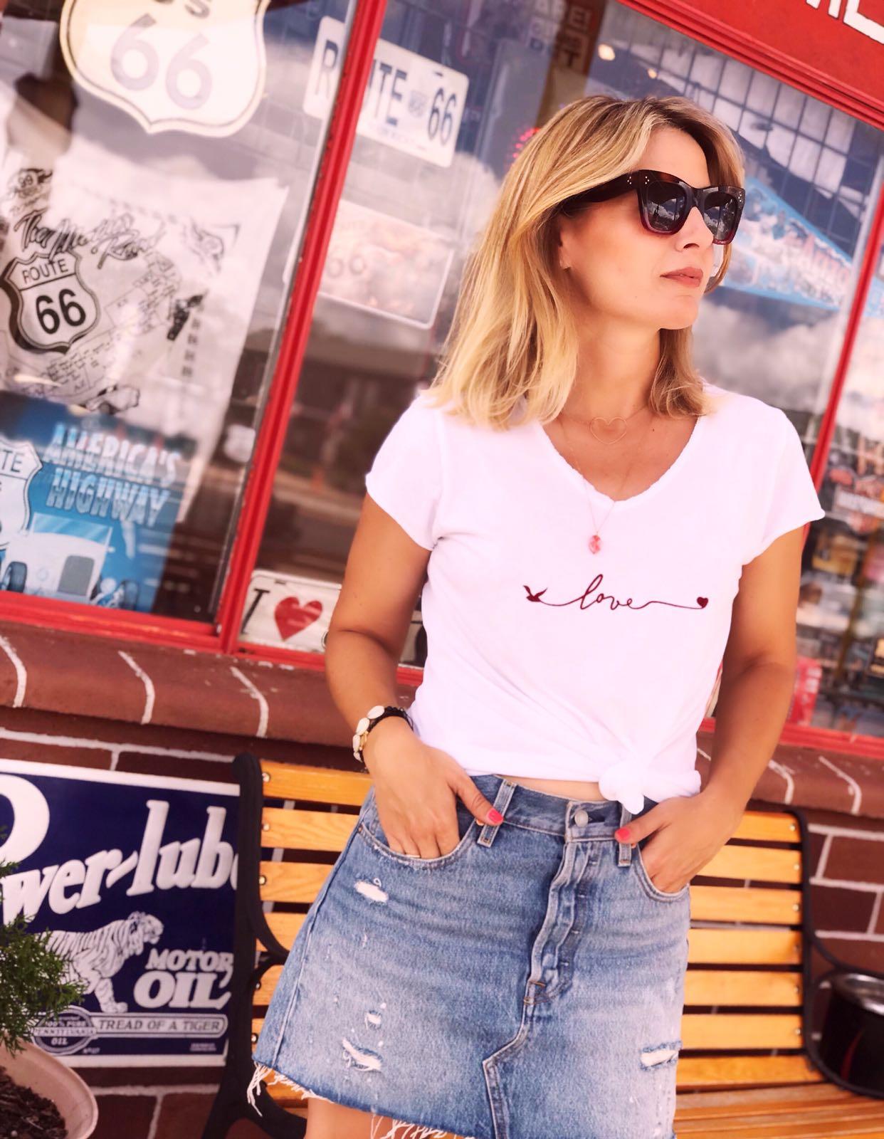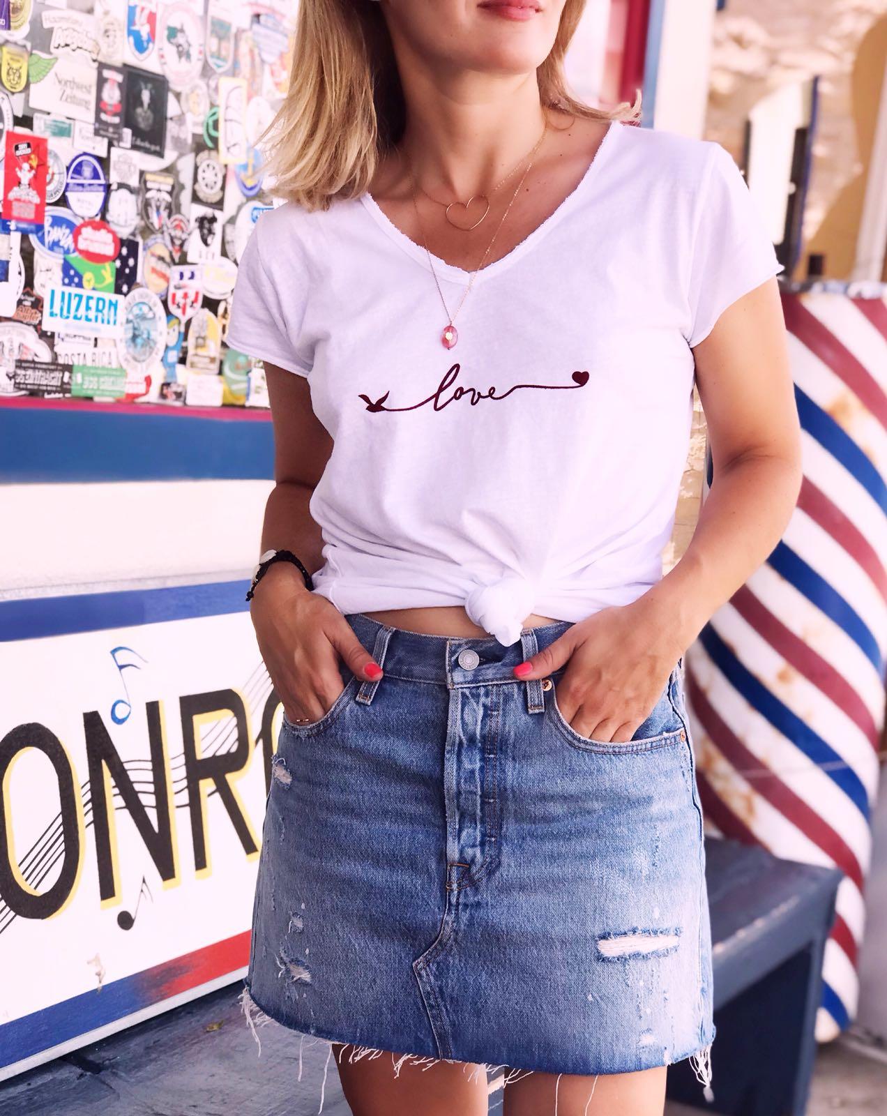 Camiseta de manga corta, escote de pico y detalle mensaje bordado LOVE. Camisetas básicas que se convierten en especiales. Ideales para combinar con todo y debajo de una chaqueta o americana.