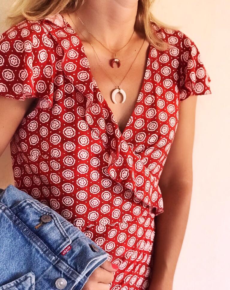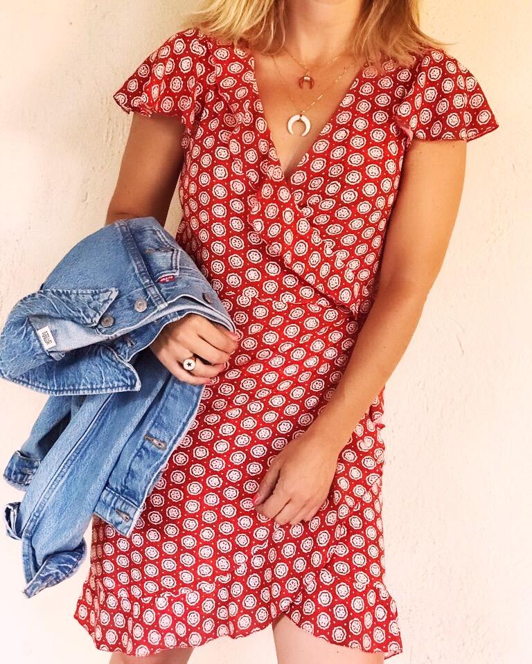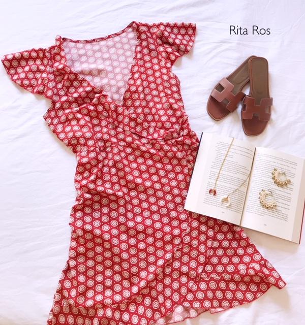 Vestido corto cruzado con un estampado súper bonito y detalle volante en manga, escote y bajo. Combínalo con una cazadora vaquera y unos botines y te encantará el resultado.