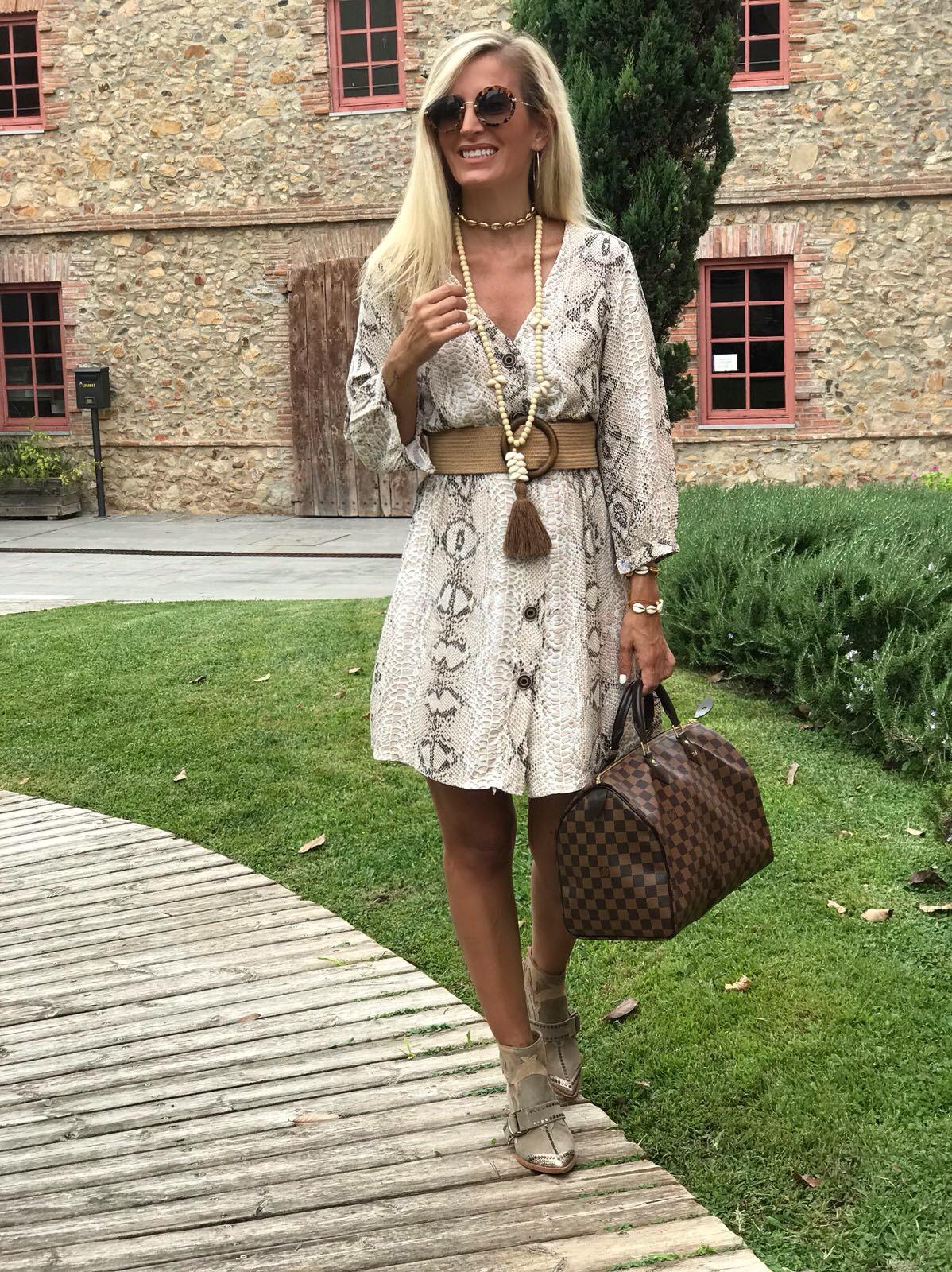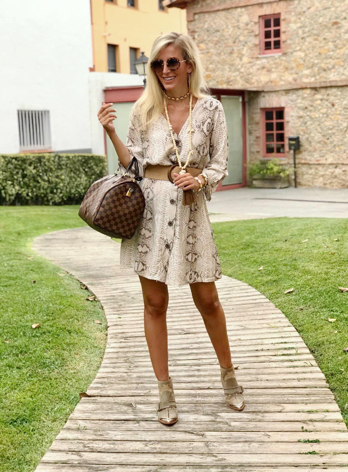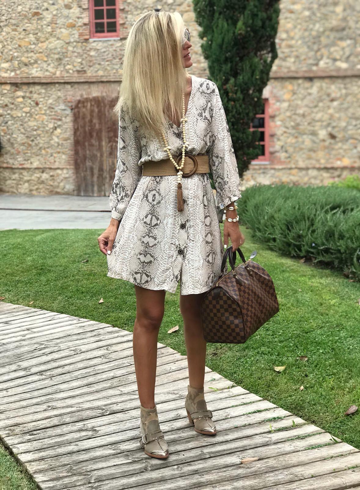Vestido corto de manga larga, escote de pico con un estampado Animal print precioso y detalle botones decorativos. Un vestido de total tendencia súper cómodo que sienta como un guante.