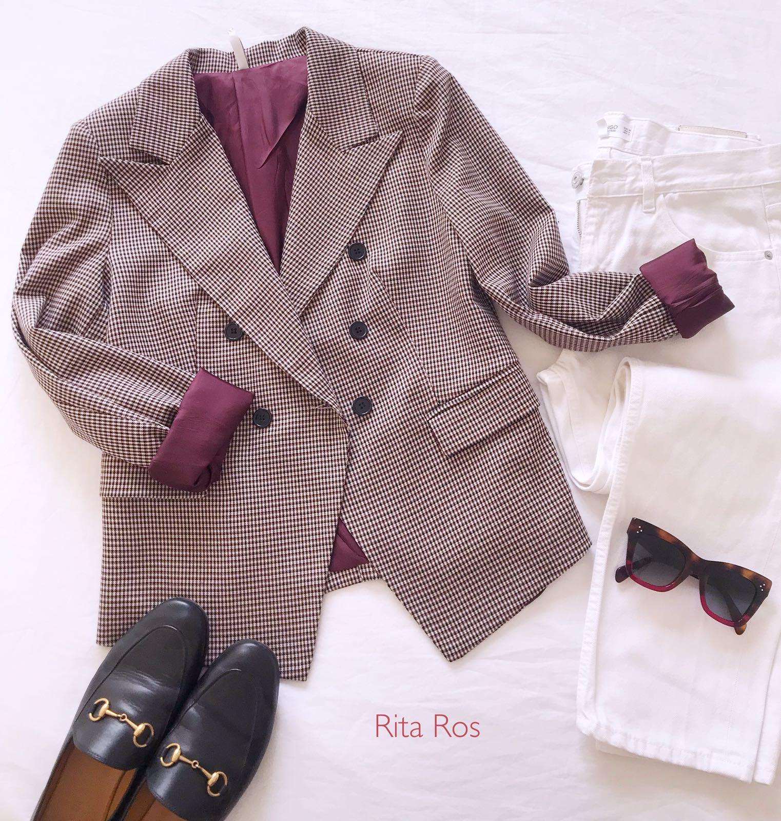 Blazer cruzada con cuello y solapas, manga larga estampada de cuadritos.