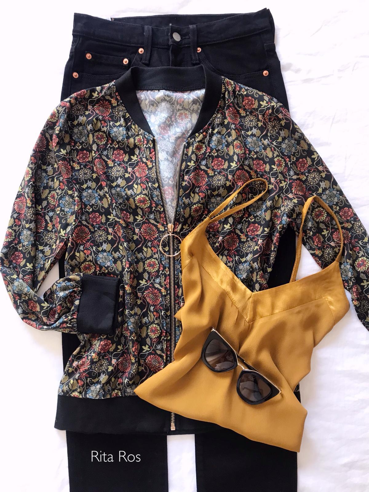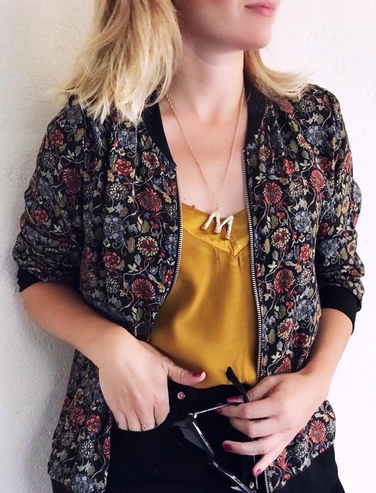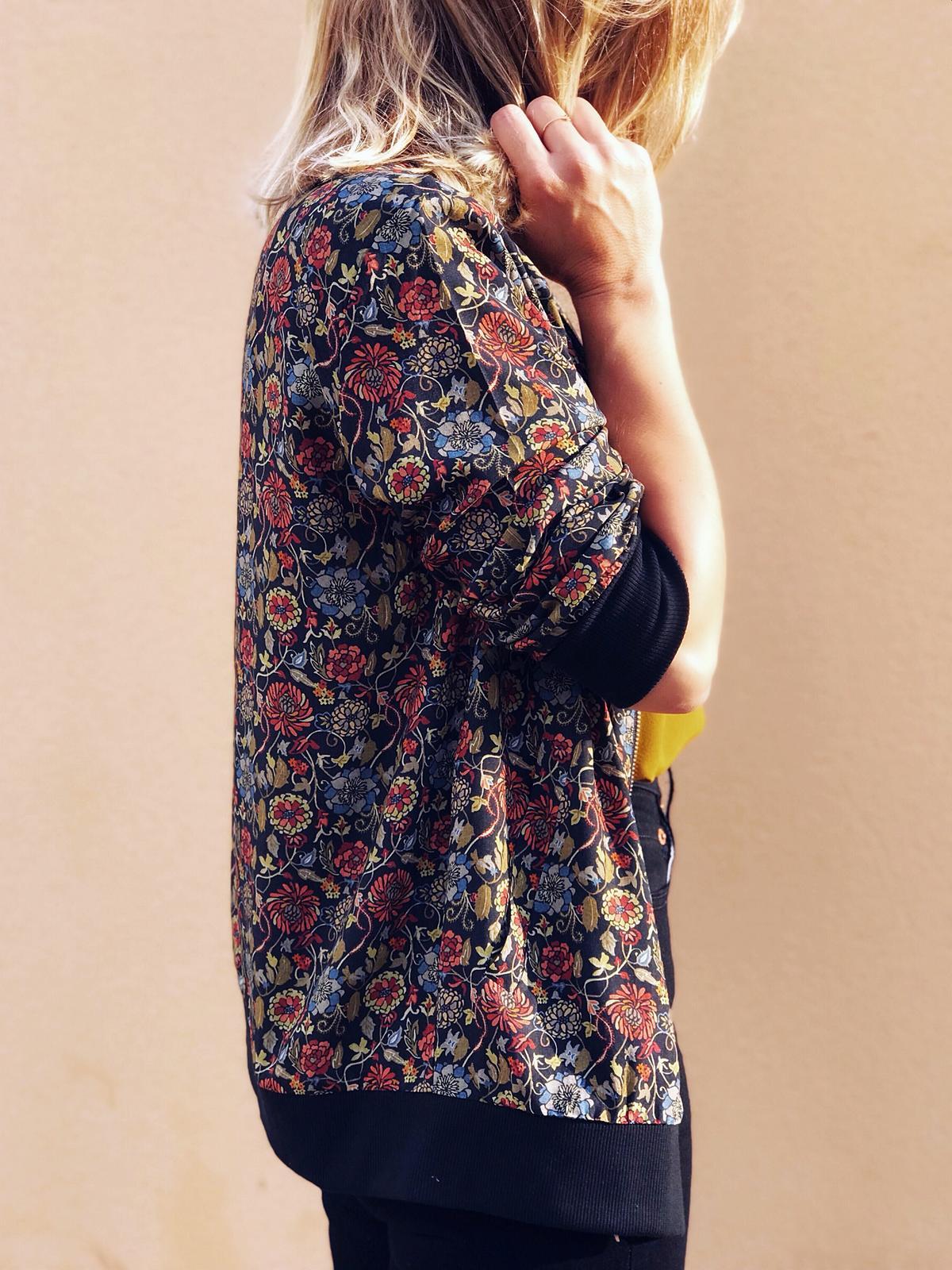Chaqueta estilo bomber estampada de flores, cuello, puños y bajo acabados en tejido canalé. Una prenda fina ideal para entretiempo que combina con un montón de colores.