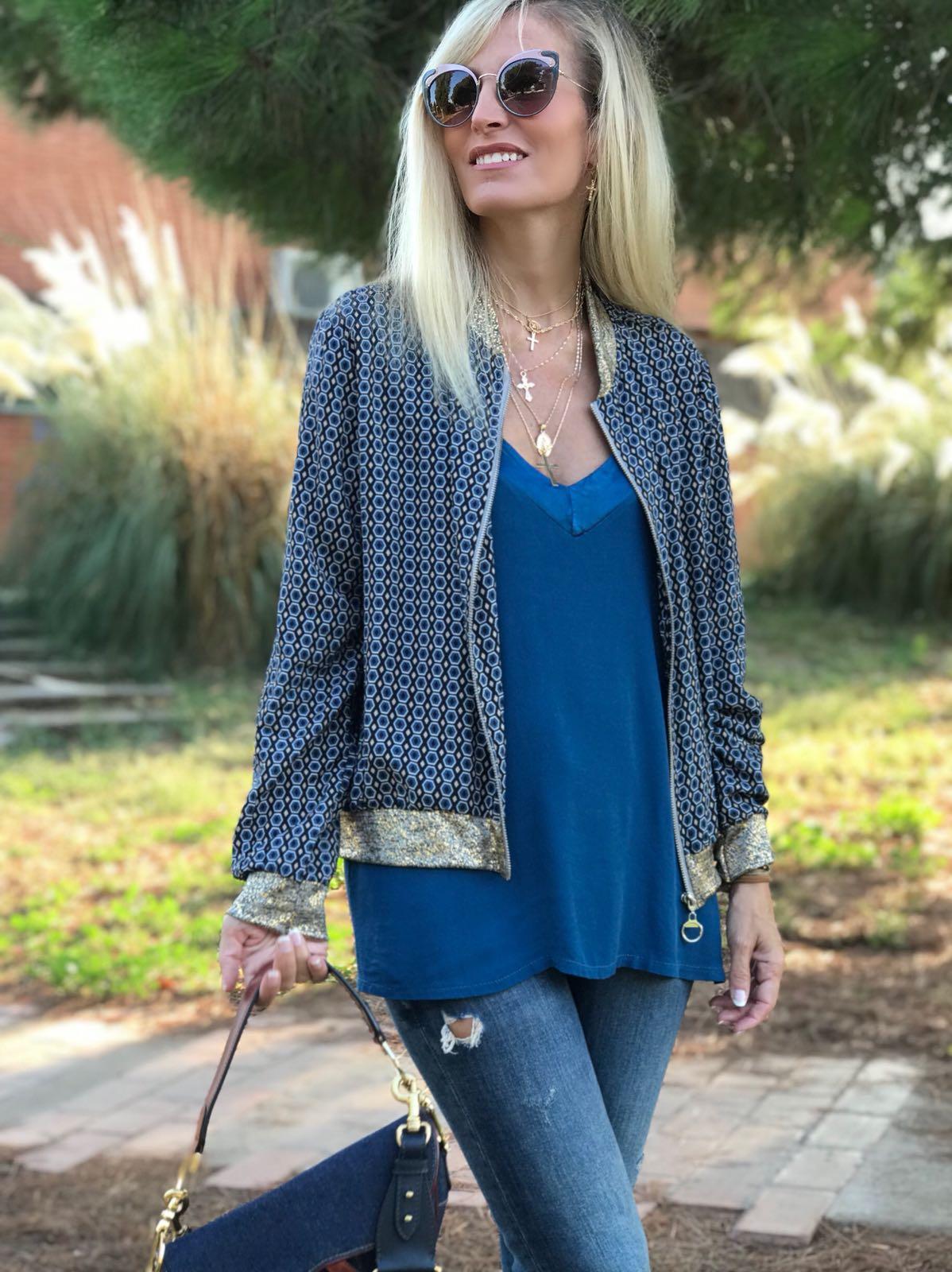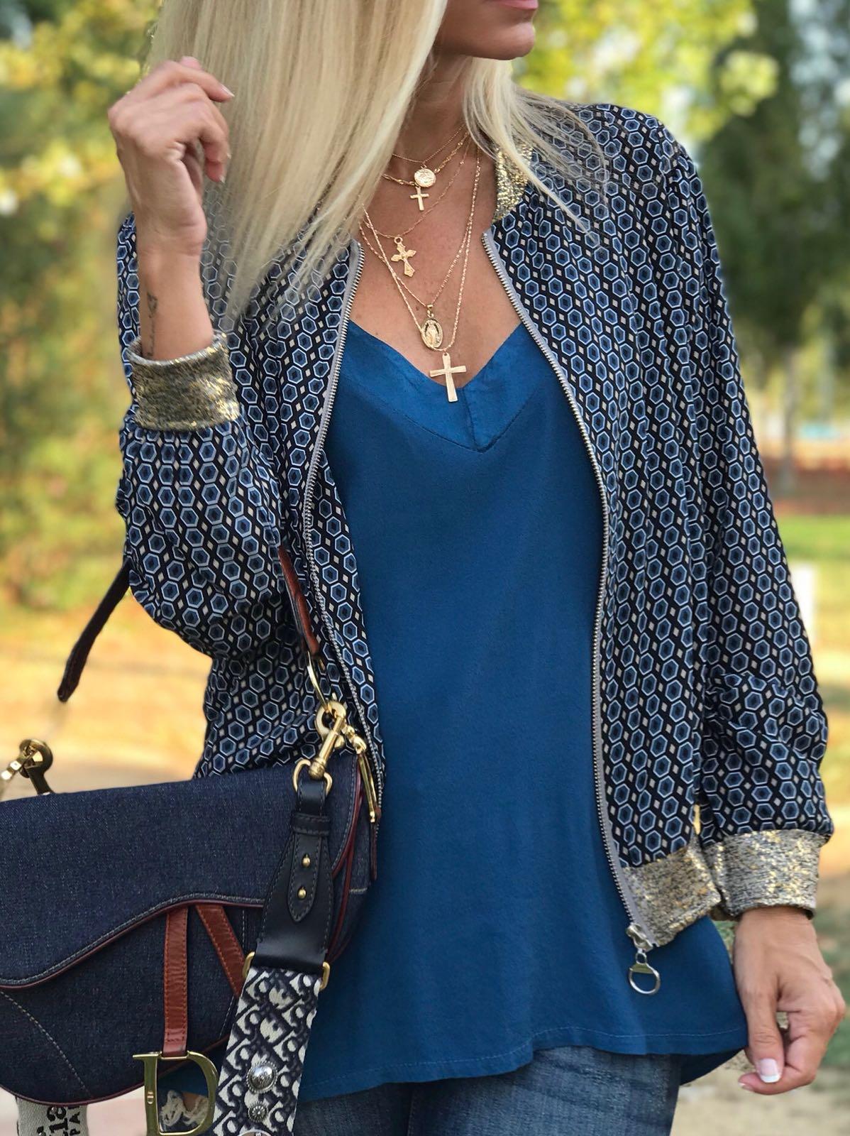 Bomber fluida de manga larga con un estampado estilo geométrico y detalle puños, cuello y bajo en dorado. Una prenda ideal para un look perfecto de entretiempo.