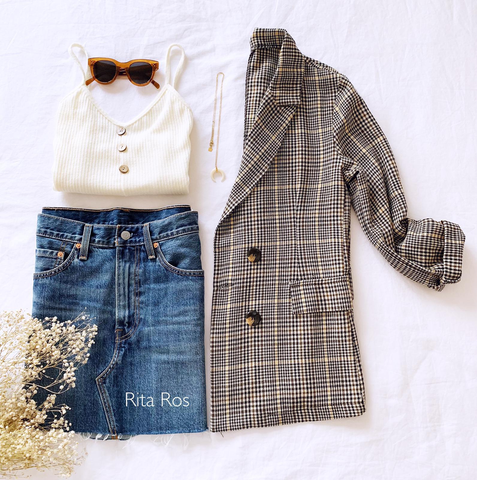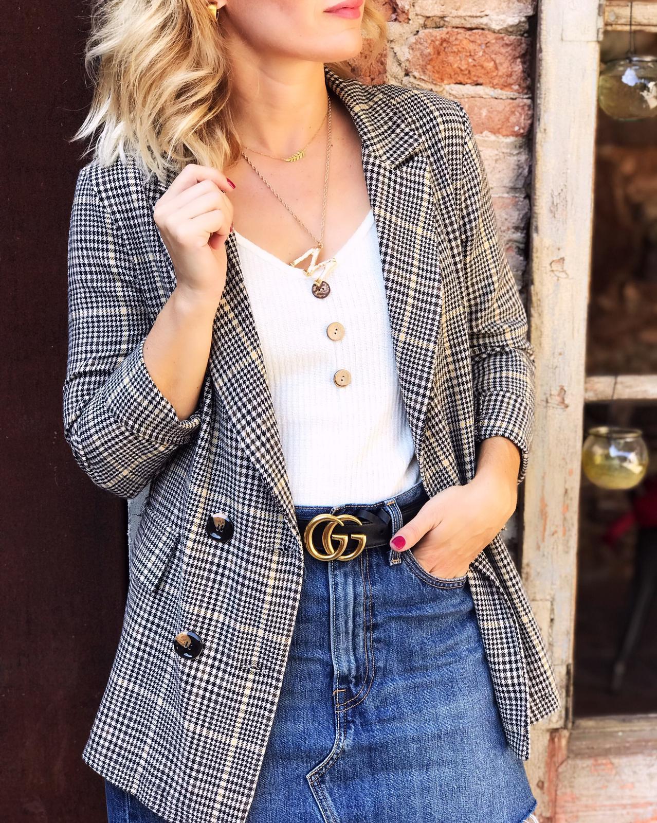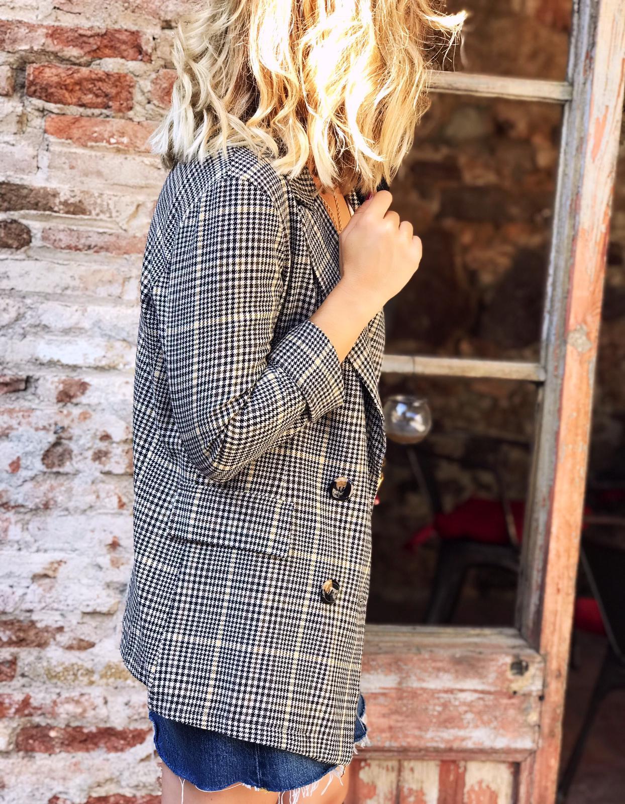Americana com cuello de solapa y manga larga estampada de cuadros. Bolsillos laterales de solapa.