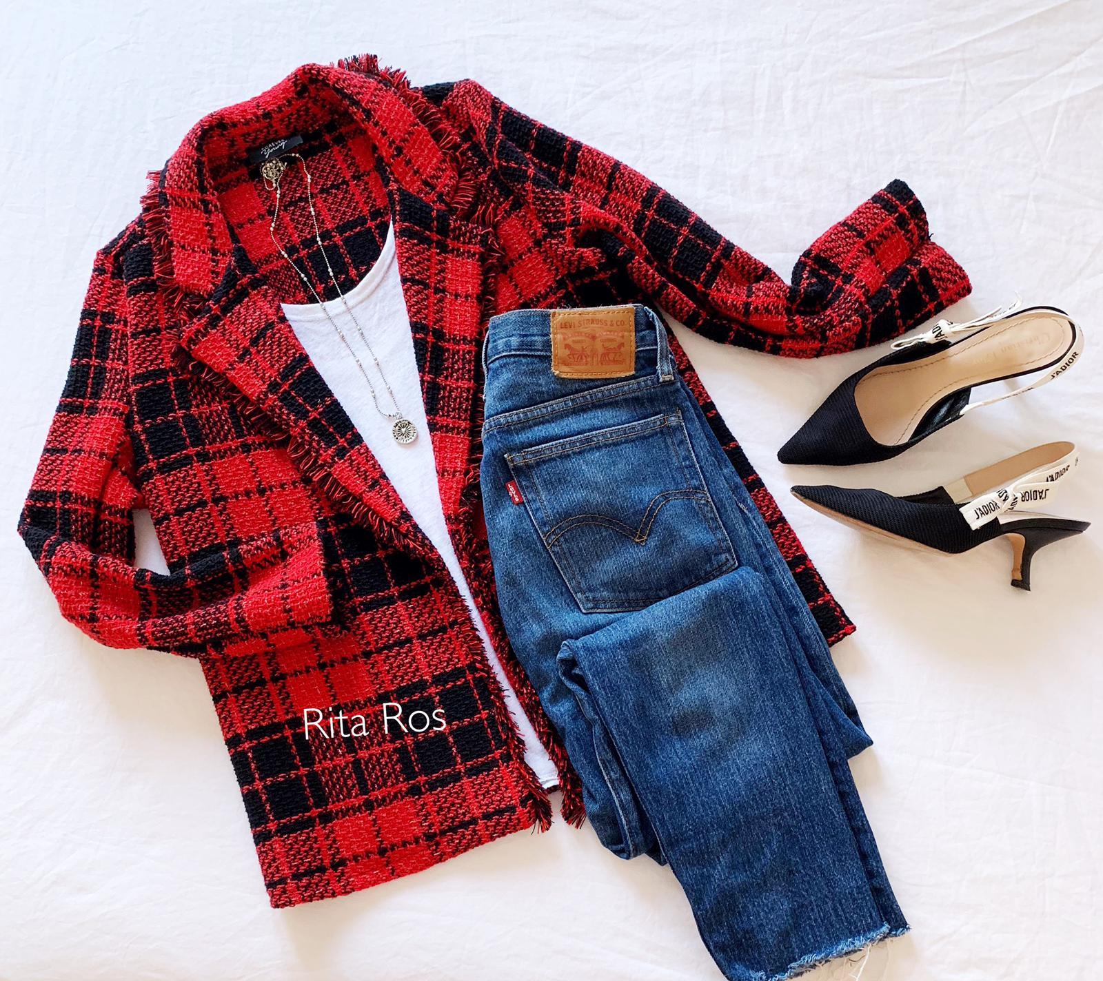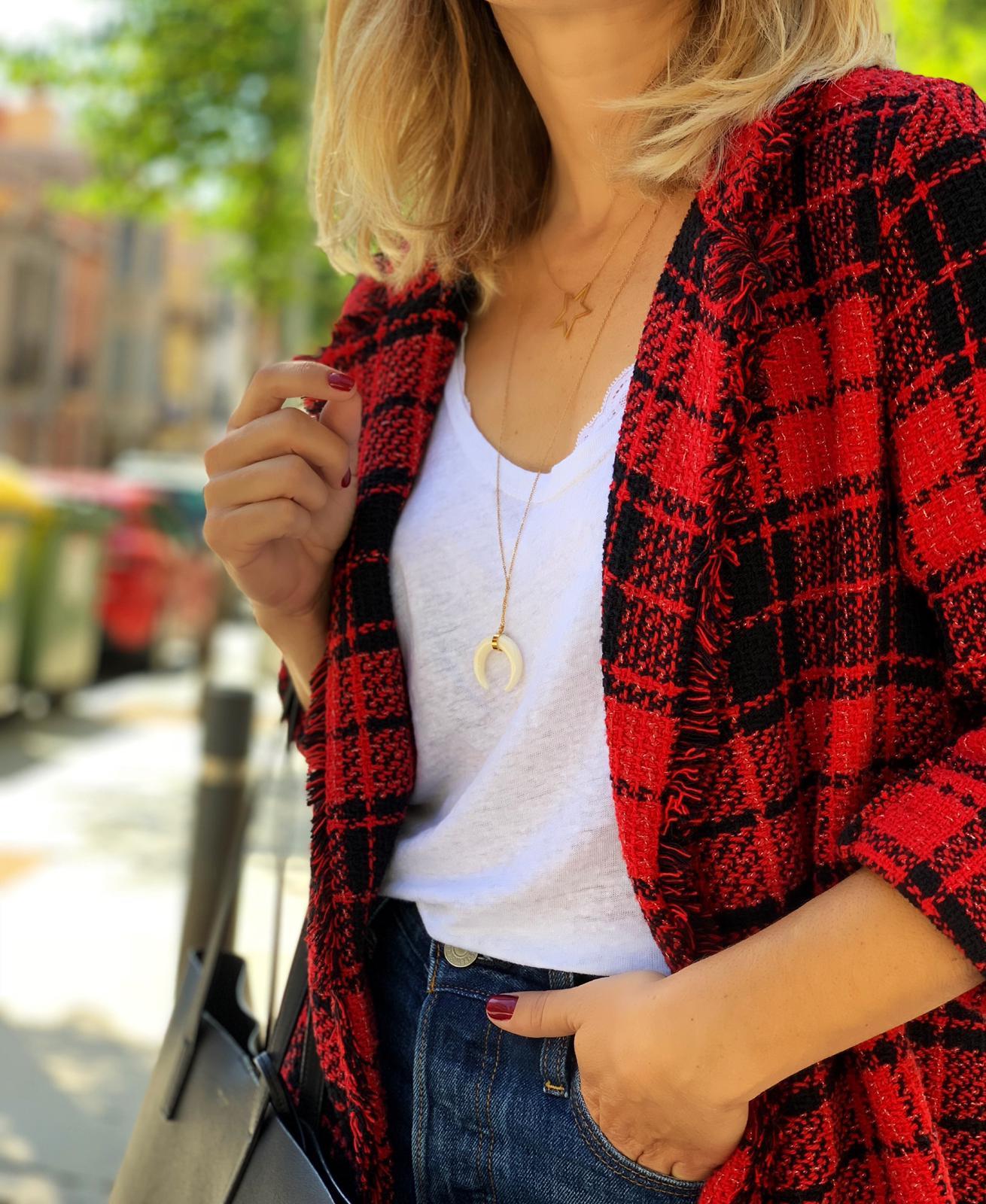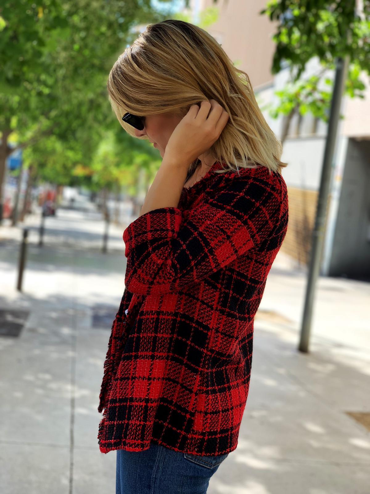 Blazer de cuello y solapa en tejido tweed, manga larga y detalle solada desflecada.