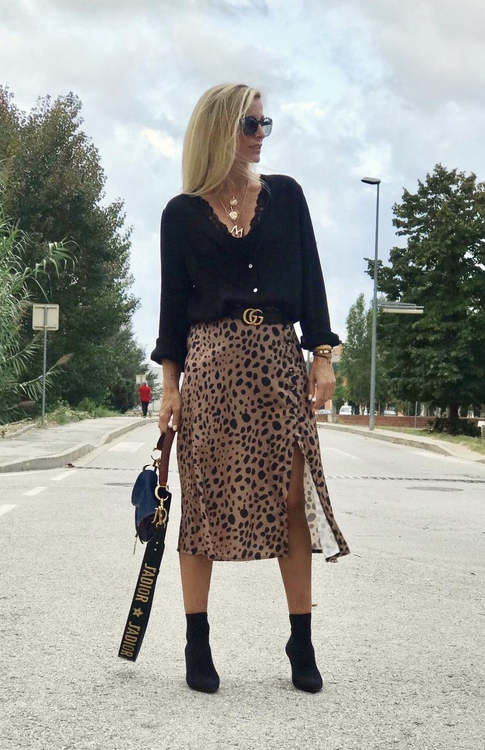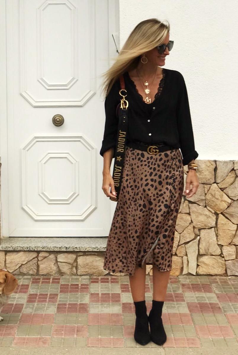 Falda midi estampada de leopardo con detalle botones y abertura en el lateral.