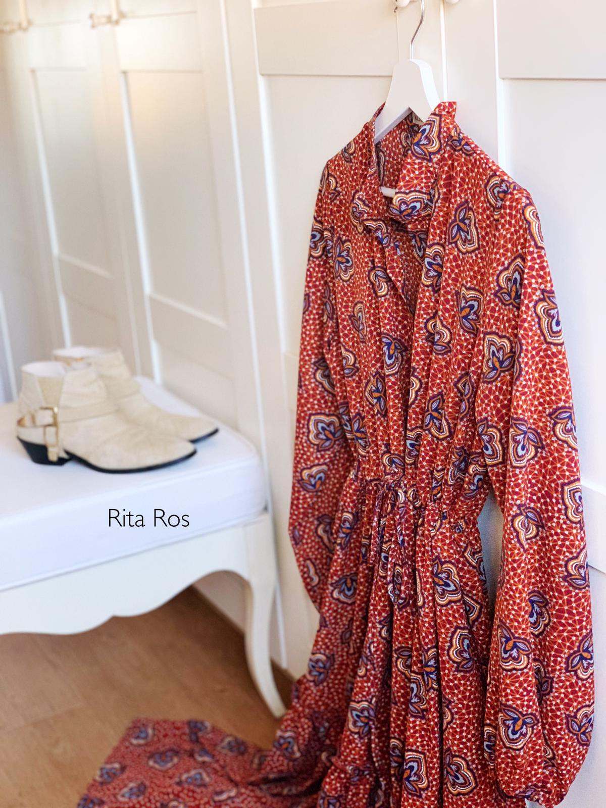 Corte asimétrico en el bajo y fruncido en la cintura con cinta del mismo tejido para anudar.