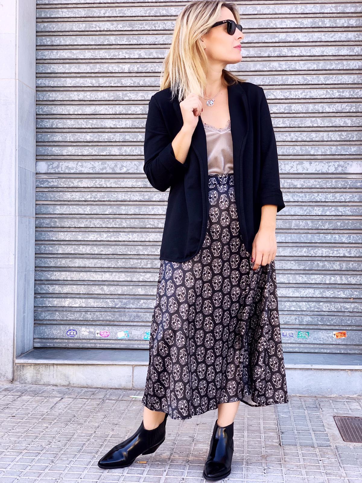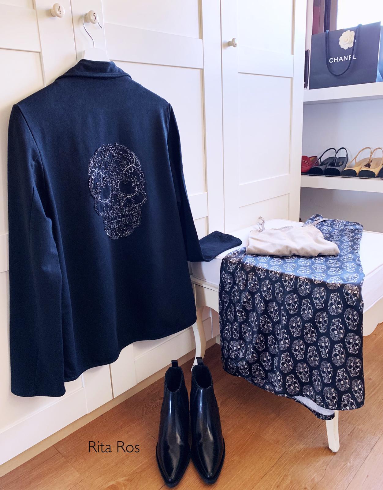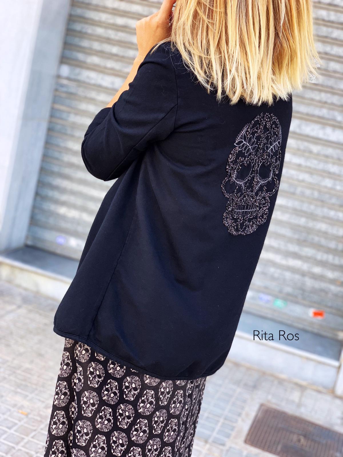 Blazer con cuello de solapa y detalle calavera con hilo plateado en la espalda. Una prenda perfecta de entretiempo con un encanto especial.