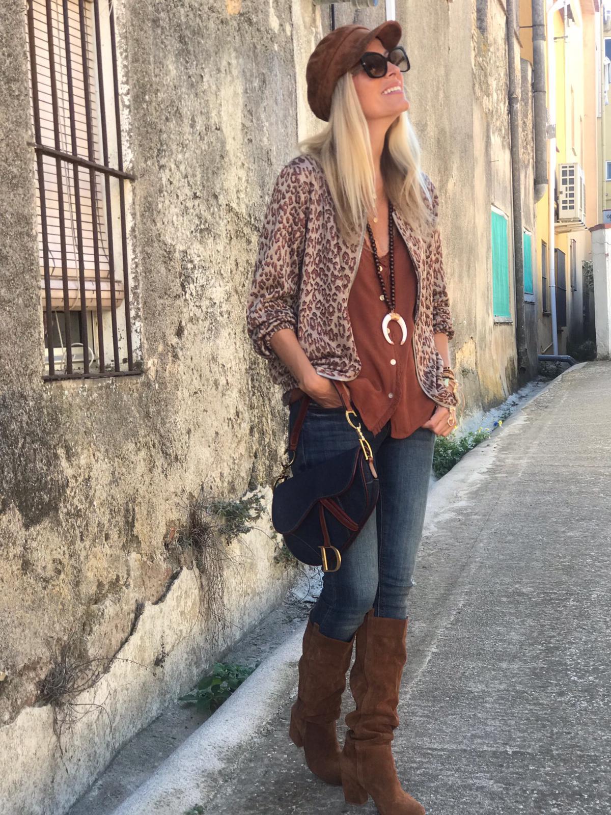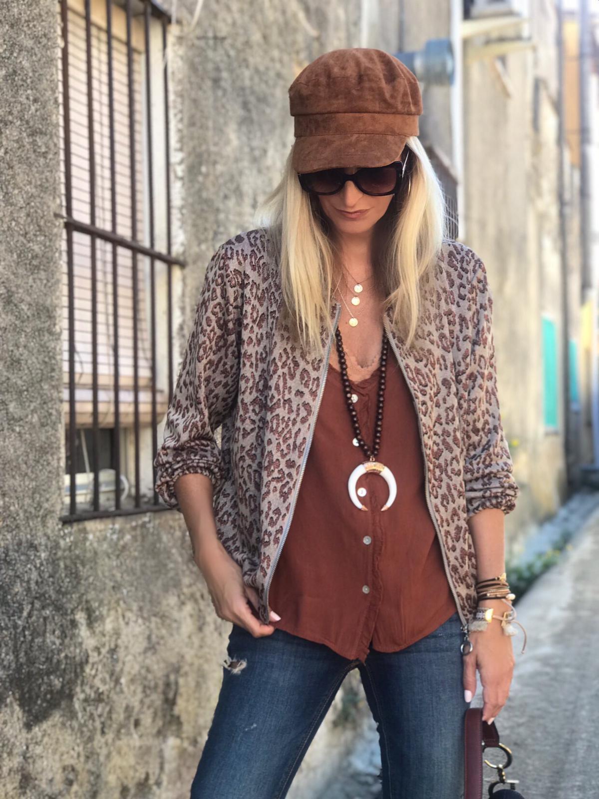 Bomber de manga larga sin cuello, estampada de leopardo. El tejido es precioso combina un punto súper bonito con glitter. Combínalo con nuestro top Grace en color whisky y te encantará el resultado.