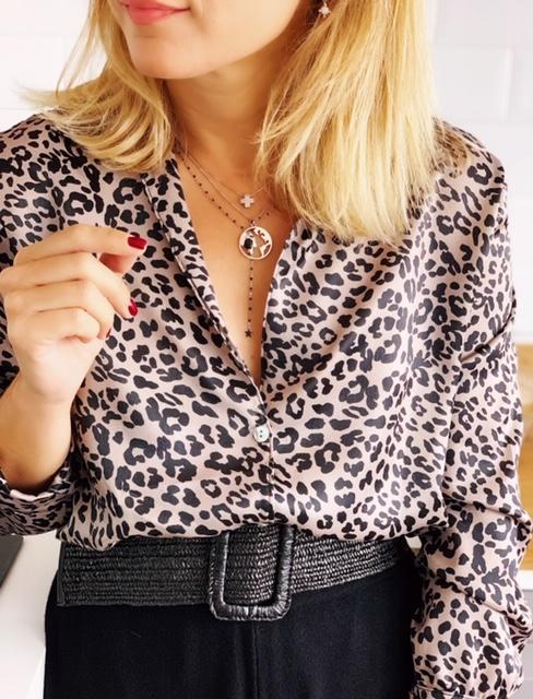 Una monada de blusa con una caída preciosa estampada de leopardo.