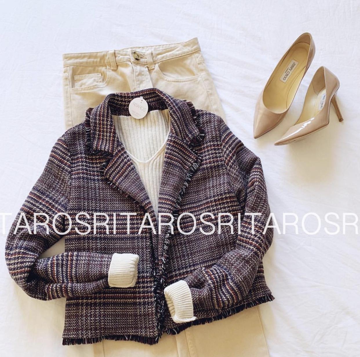 Chaqueta tipo blazer corta, manga larga y cuello de solapa en tejido Tweed. Ribetes desflecados y con un estampado ideal. Combínala con nuestra camiseta Vogue en blanco y unos jeans, te encantará el resultado