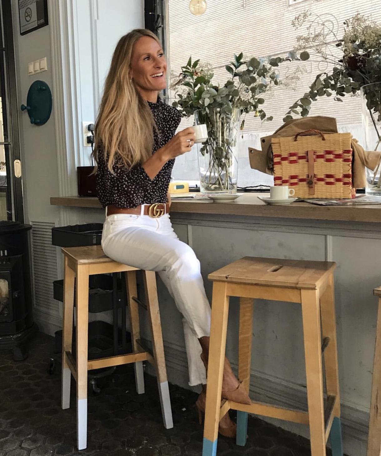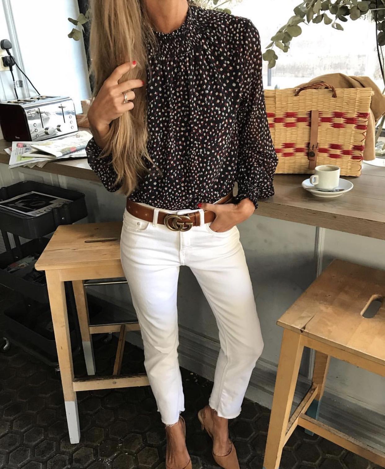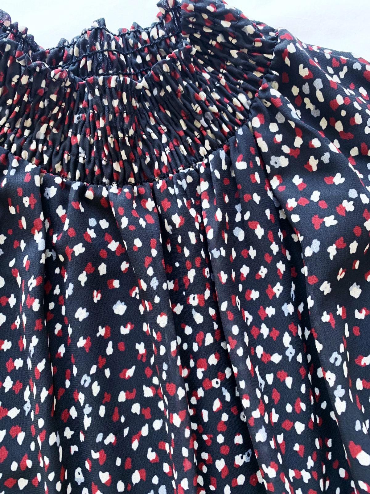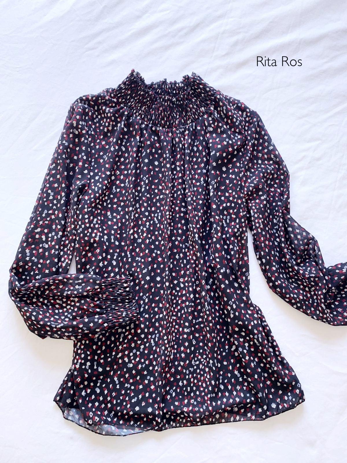 Una monada de blusa estampada, manga larga y cuello subido fruncido.