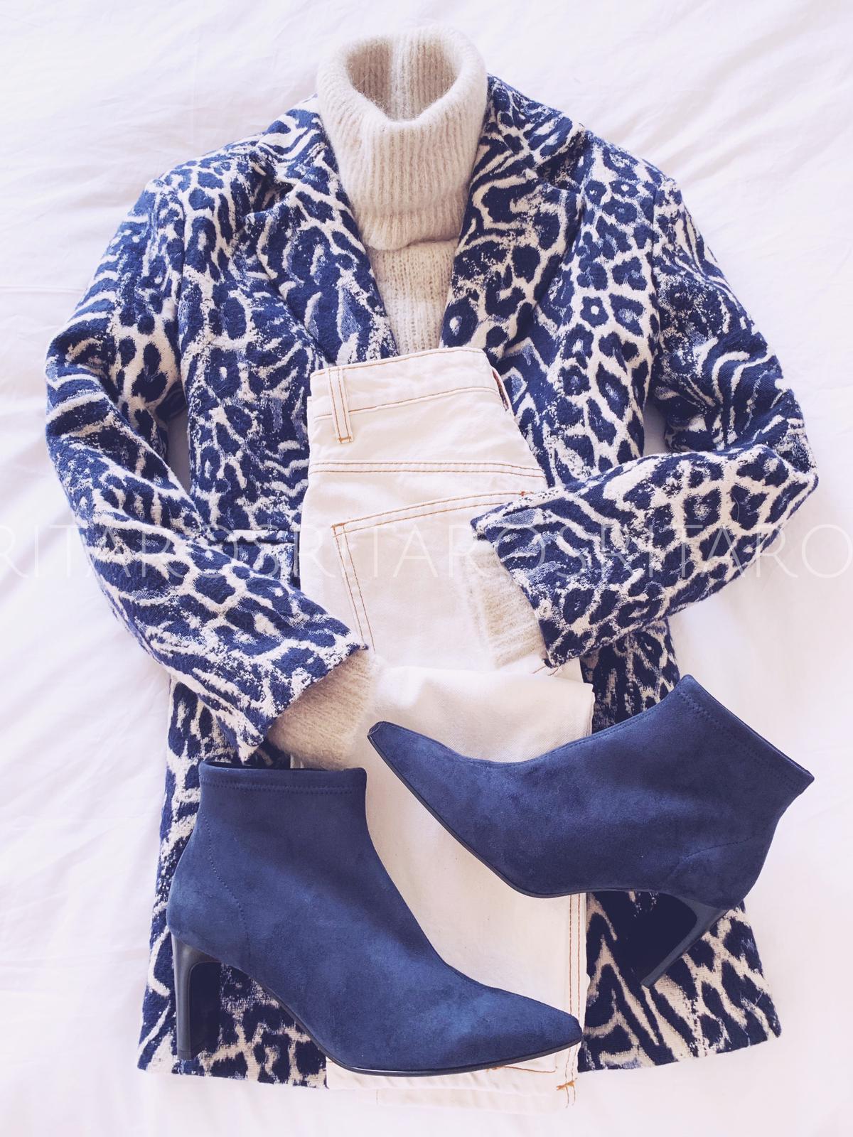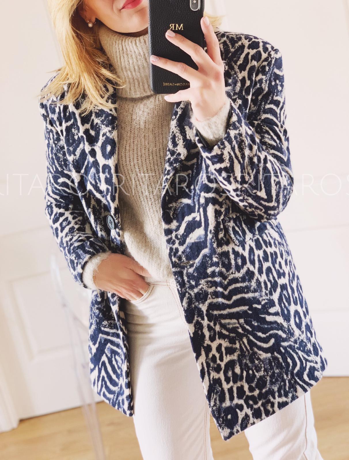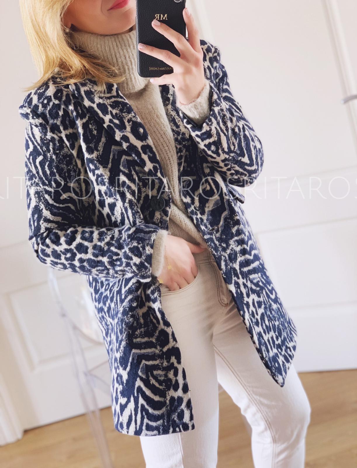 Abrigo con cuello y solapas de corte recto, manga larga estampado de leopardo con tonos azul marino y beige.