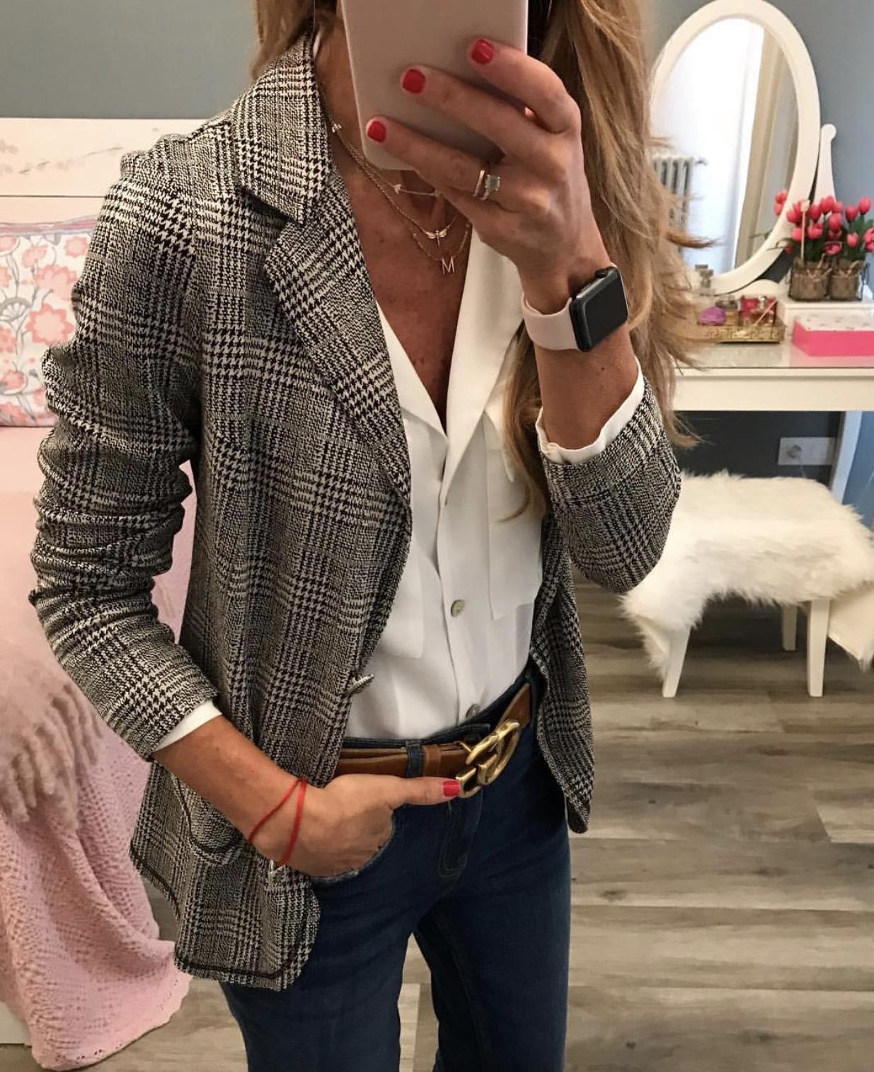 Blazer con cuello solapa, manga larga, estampada de cuadros y bolsillos frontales de solapa. Una prenda muy cómoda ideal para entretiempo.