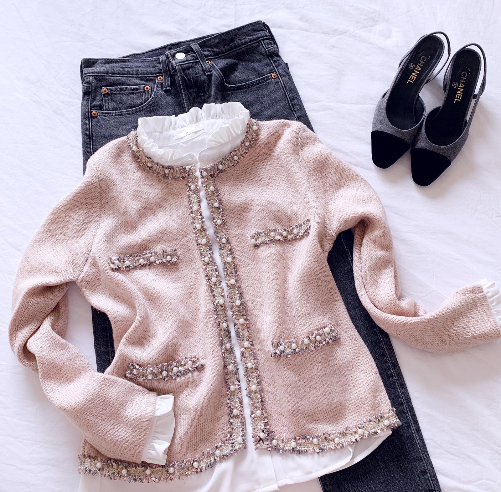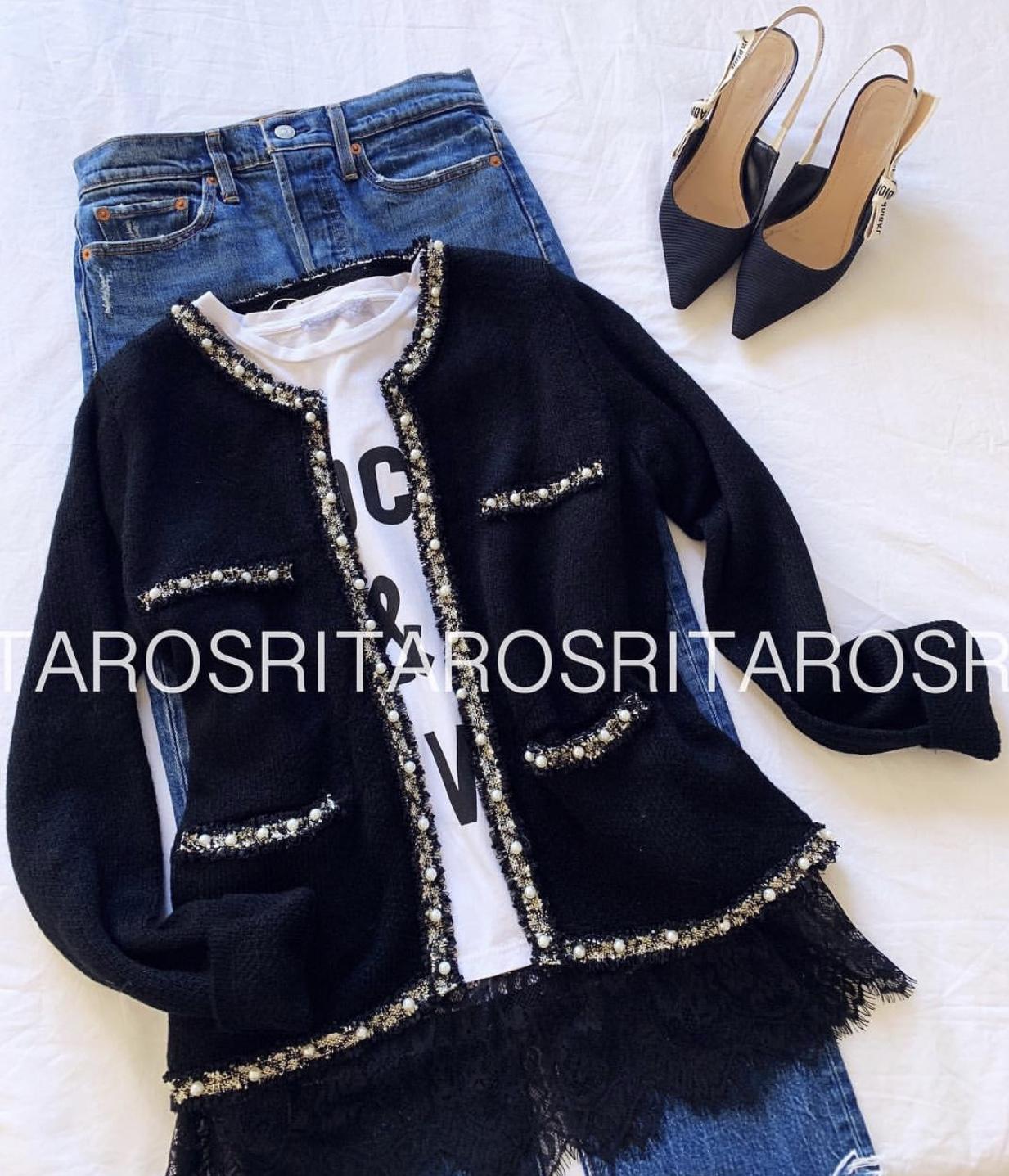Chaqueta de cuello redondo y manga larga con detalle perlitas en ribetes. Una maravilla de chaqueta con un tejido y detalles preciosos.