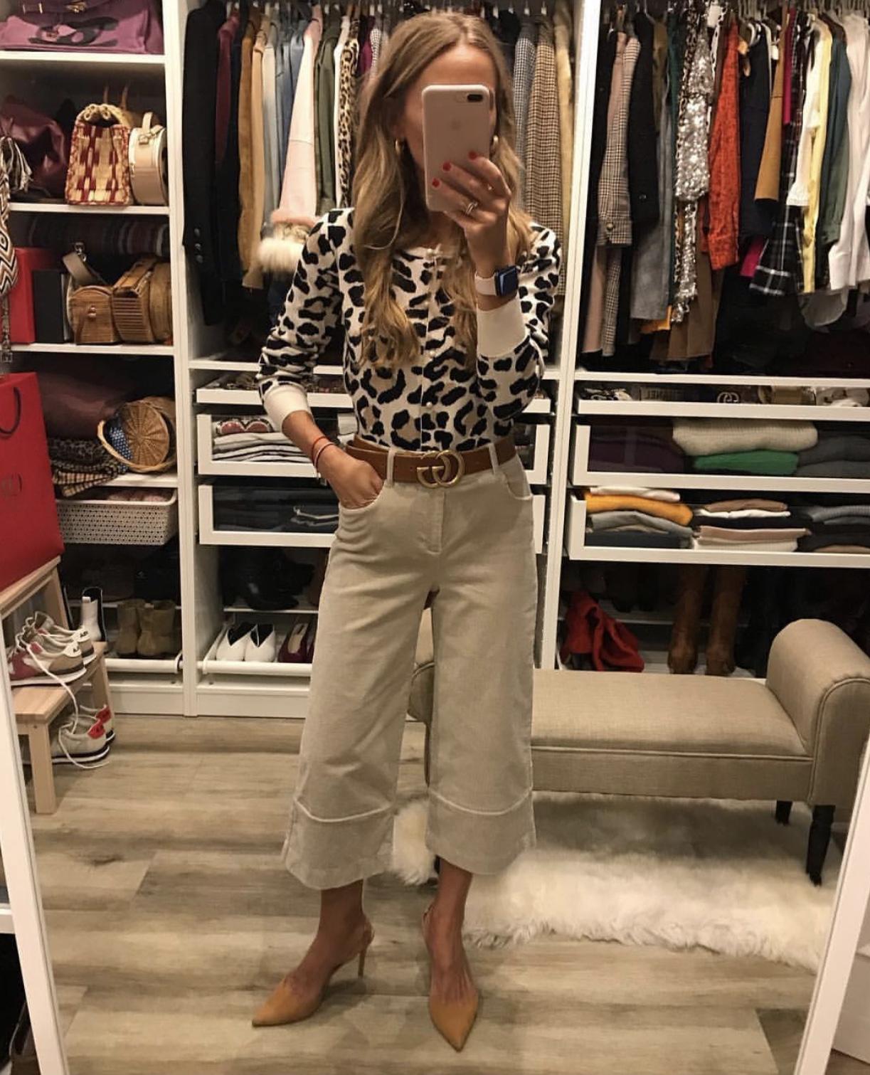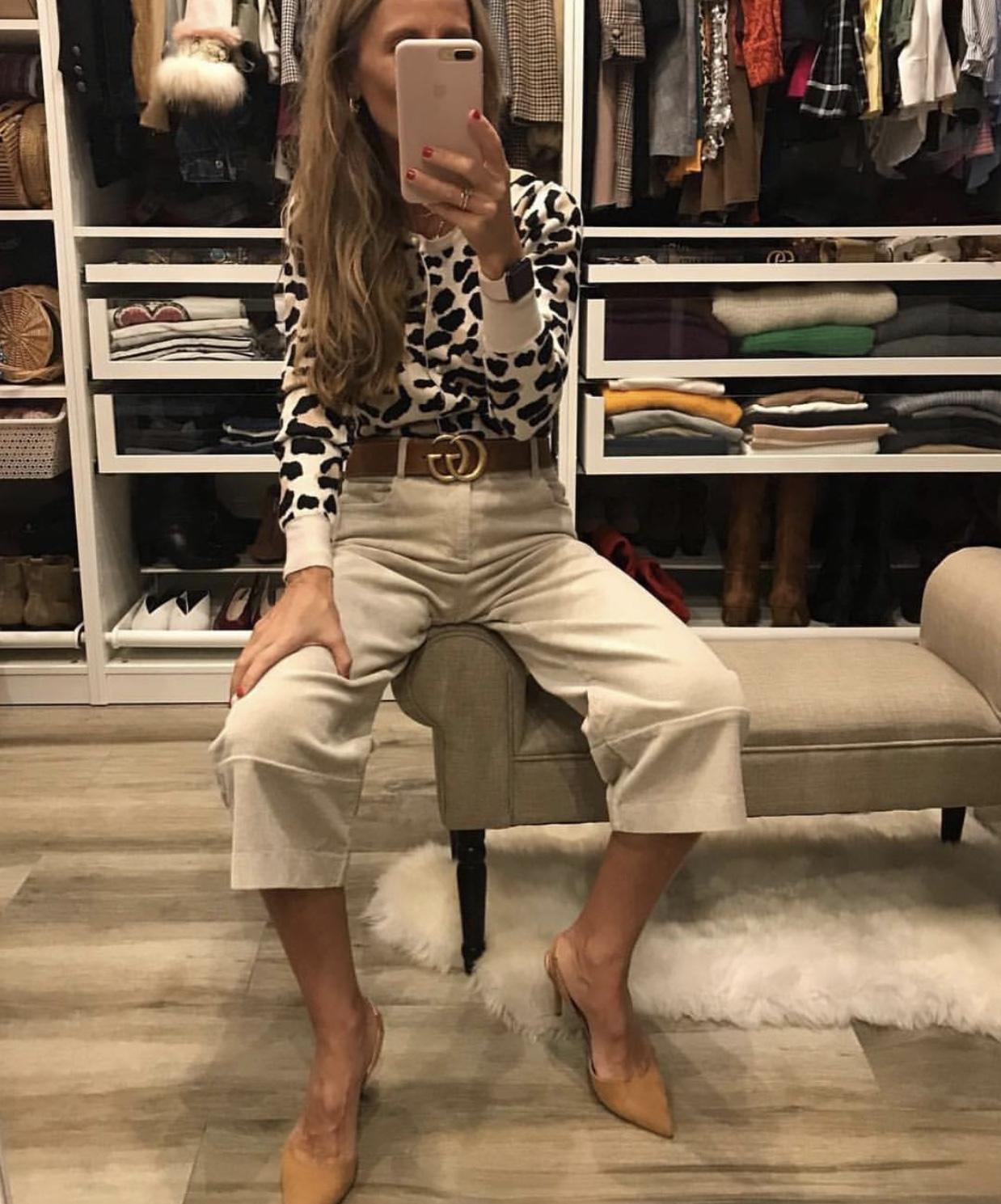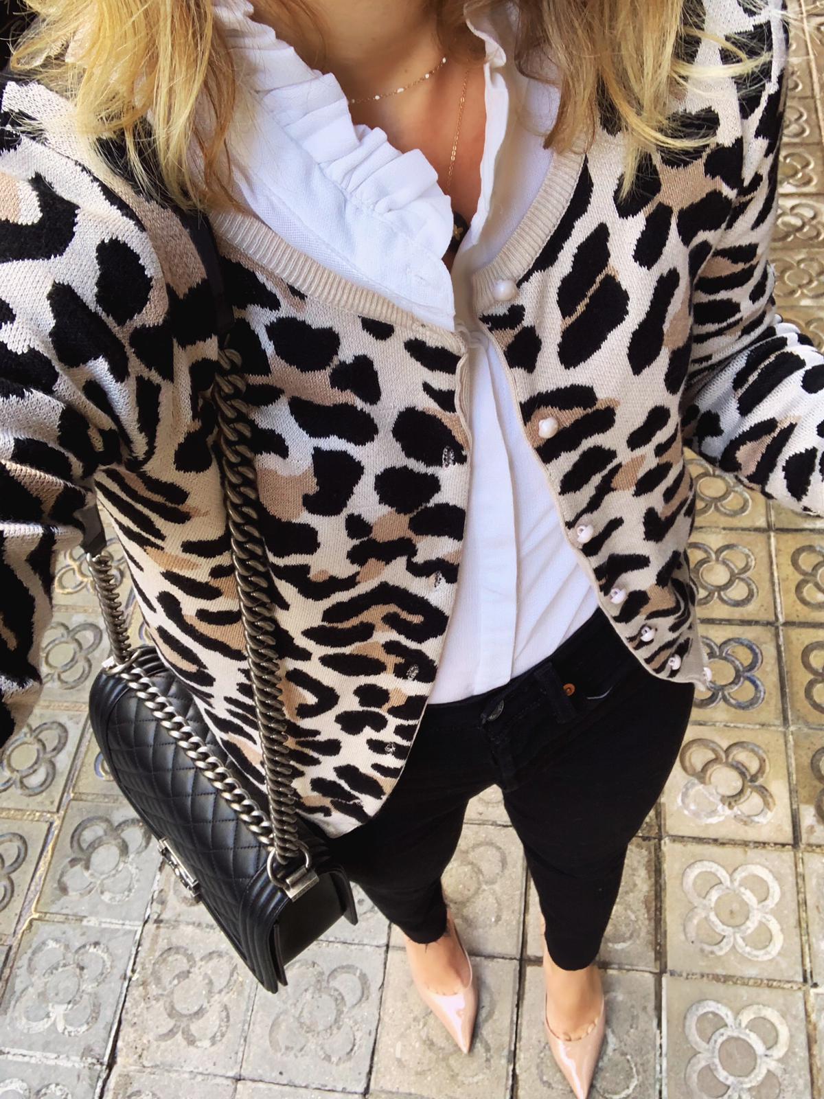 Chaqueta corta de punto de cuello redondo y manga larga, estampada de leopardo y detalle botón tipo perla.