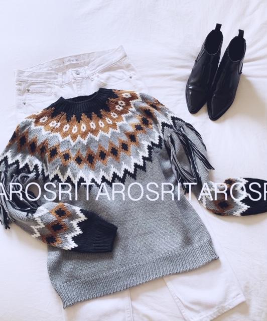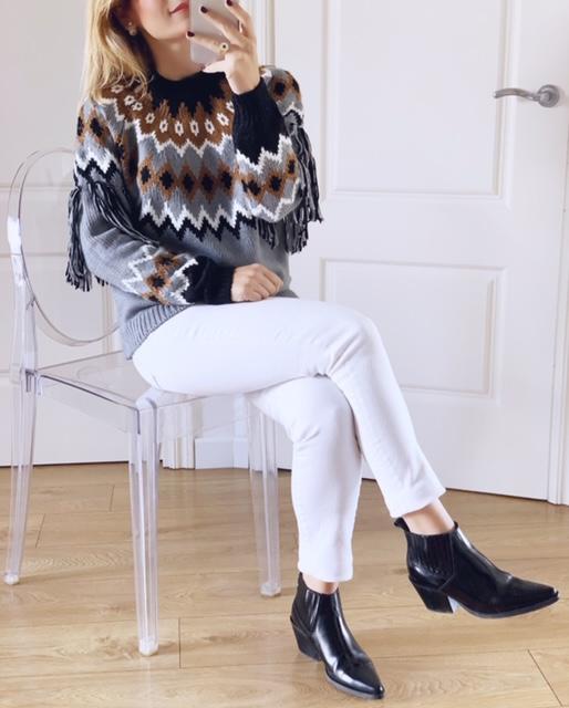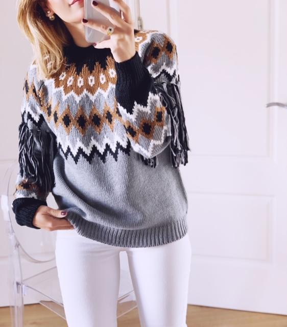 Jersey de punto cuello subido y manga larga estampado geométrico con detalle flecos en las mangas.