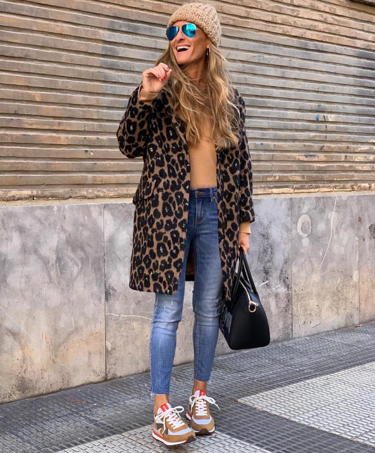 Abrigo con cuello y solapas de corte recto, manga 3/4 estampado de leopardo.