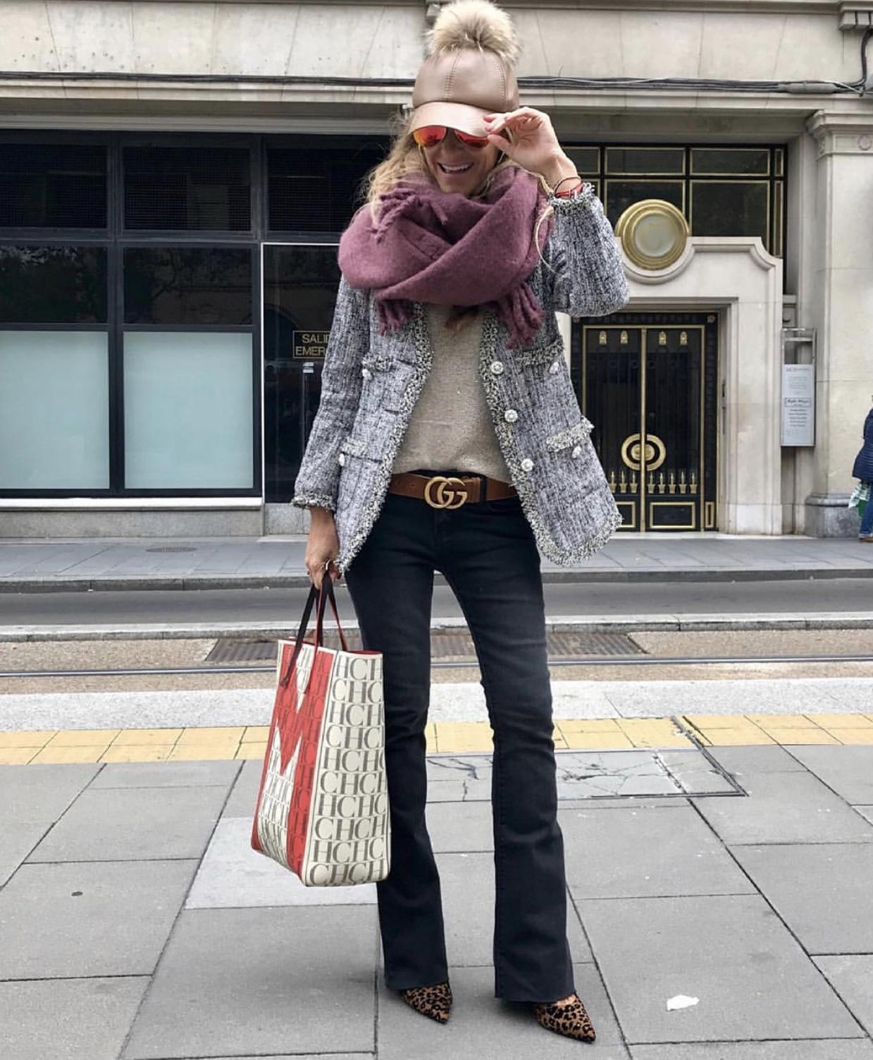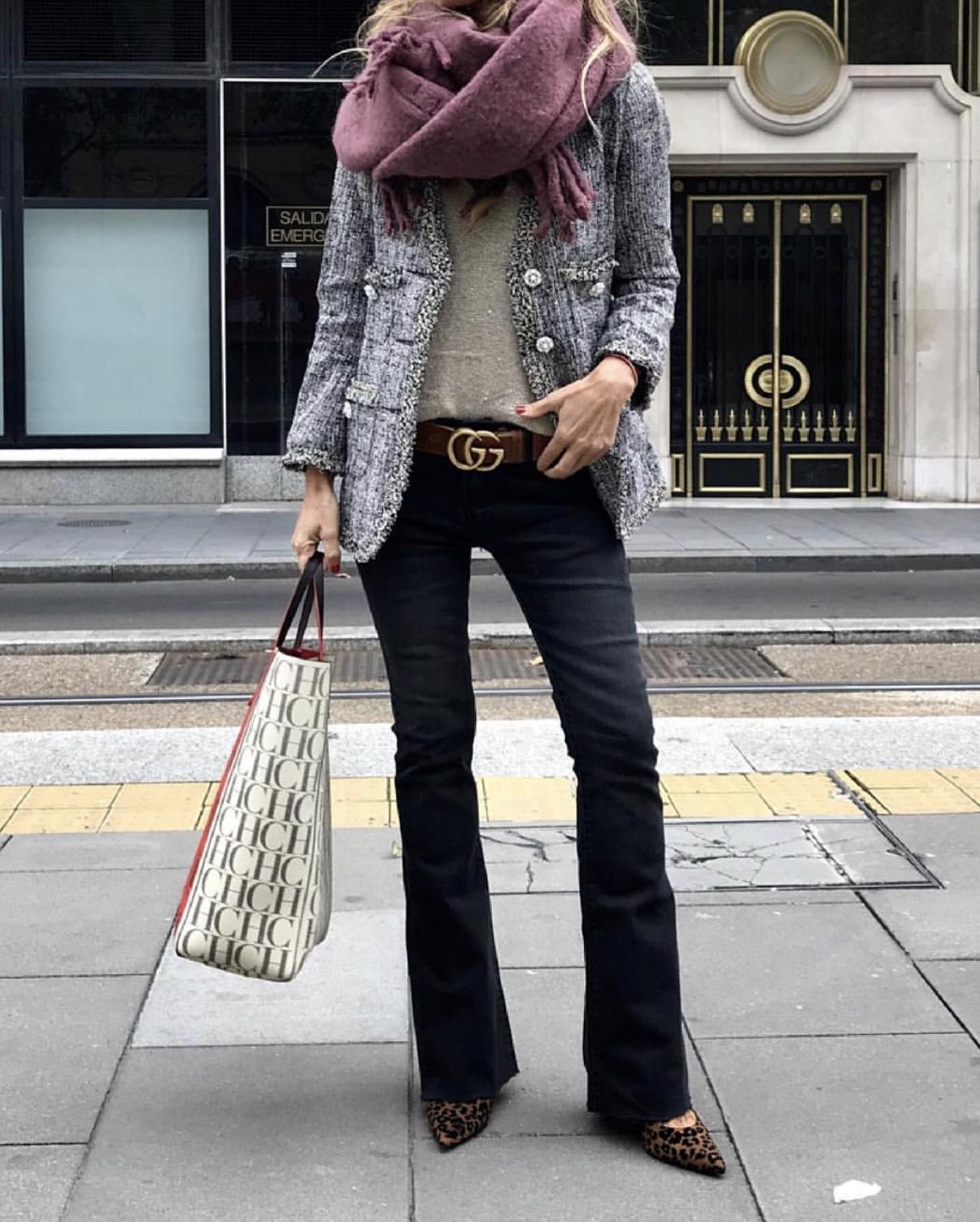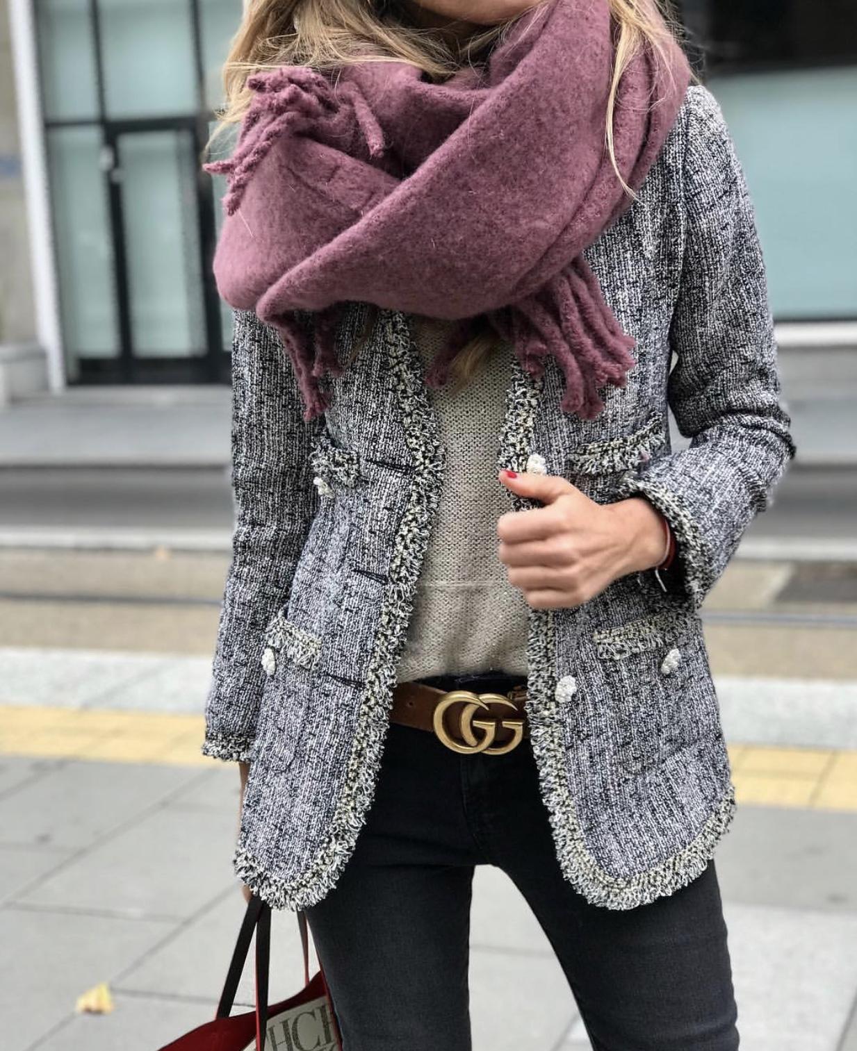 Blazer en tejido Tweed ligeramente entallada, escote pico, manga larga y cierre frontal con botón de perlitas. Ribetes desflecados.