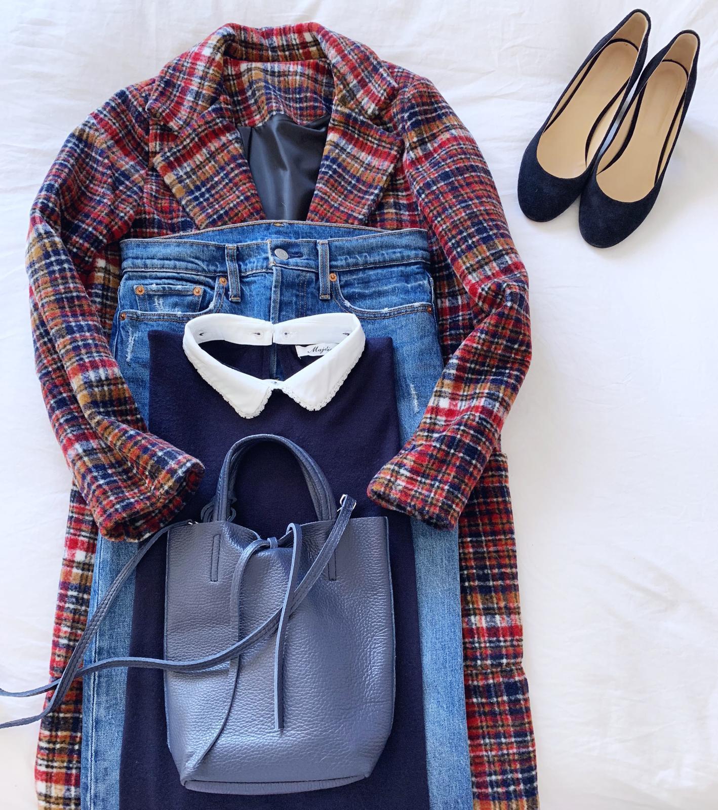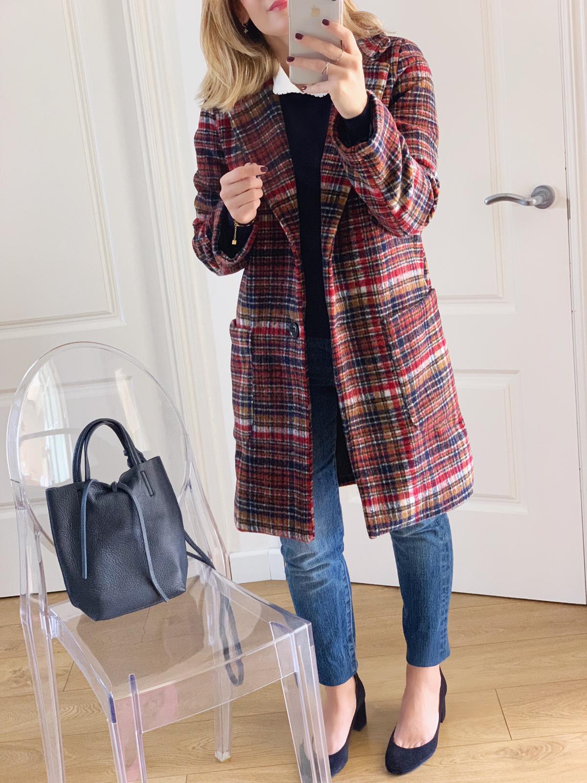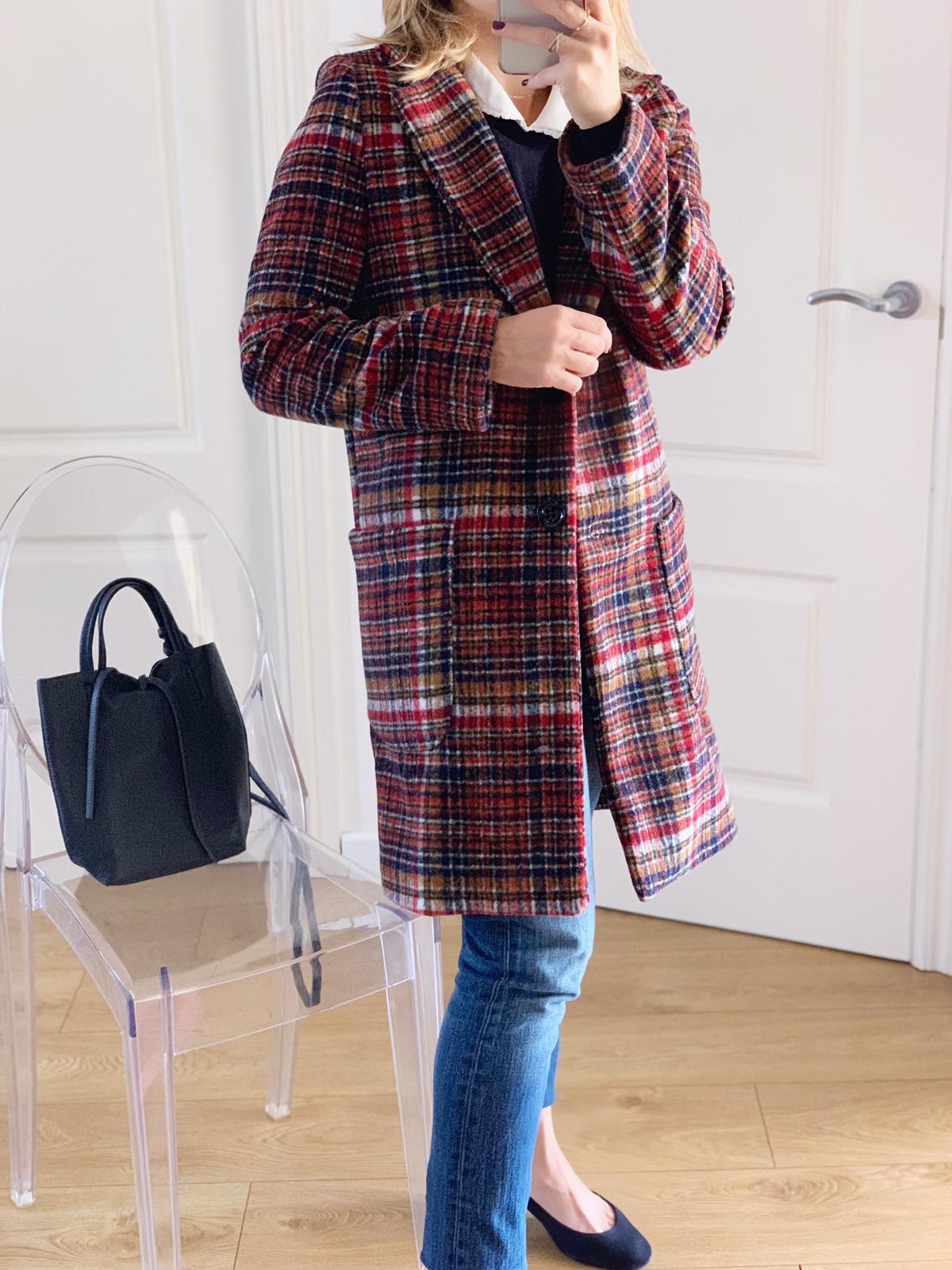 Abrigo de cuello y solapas, corte recto y manga larga estampado de cuadros. Combínalo con nuestro jersey Martina en azul marino y te encantará el resultado.