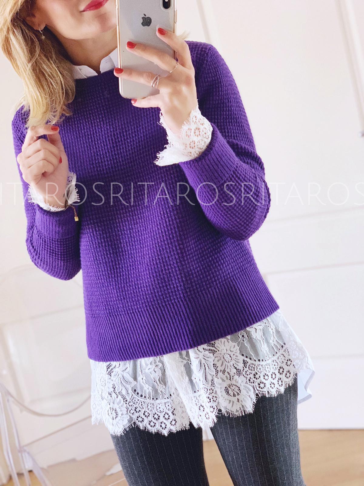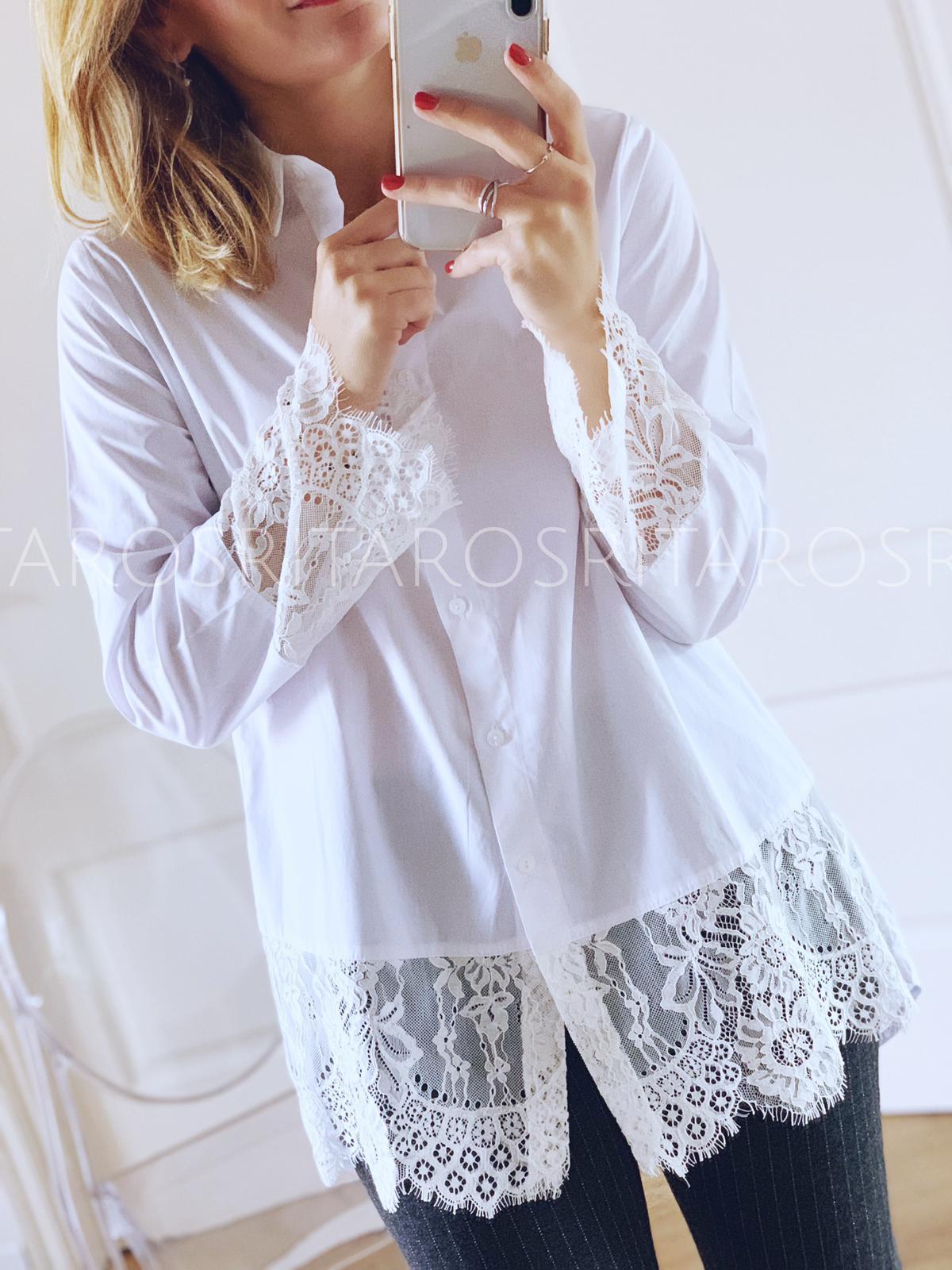 Camisa de cuello solapa y manga larga con detalle encaje en el bajo y manga. Ideal para combinar con jerseis.