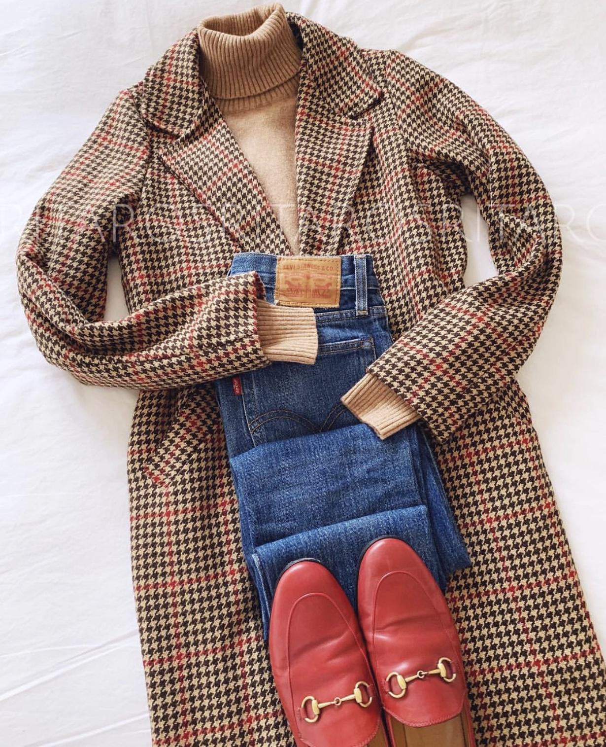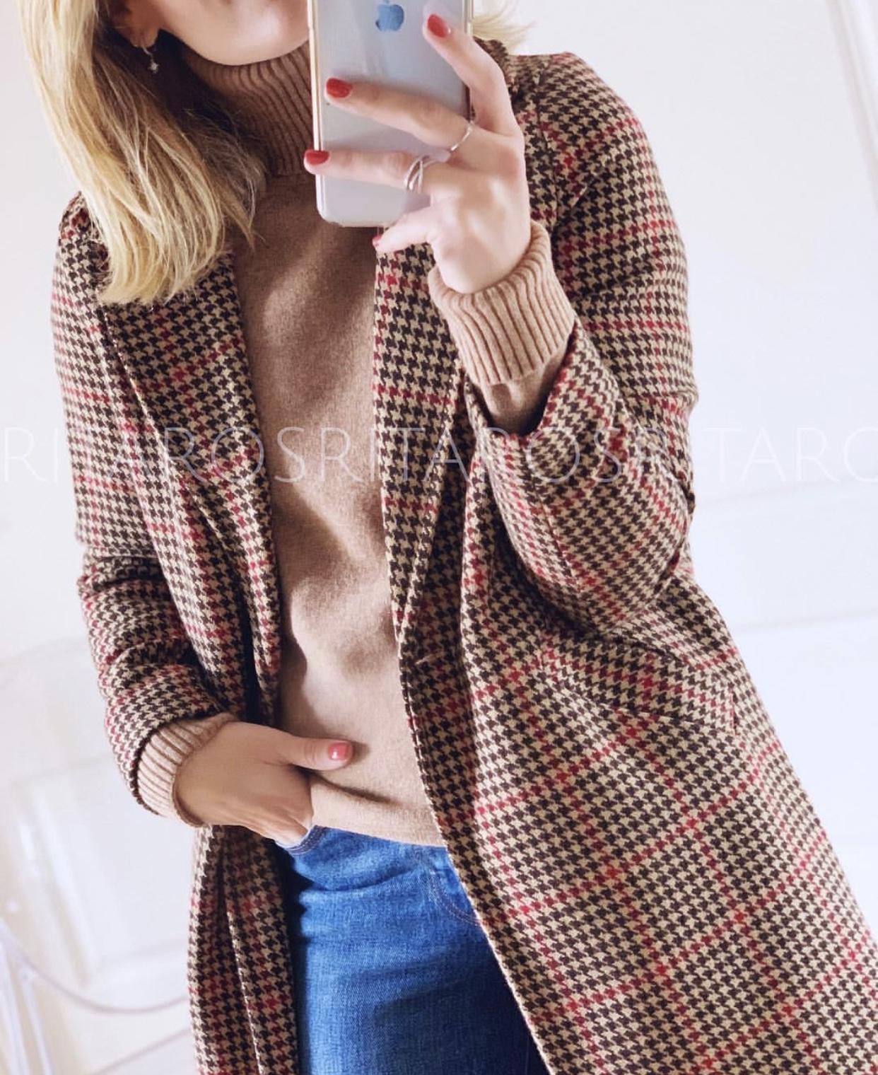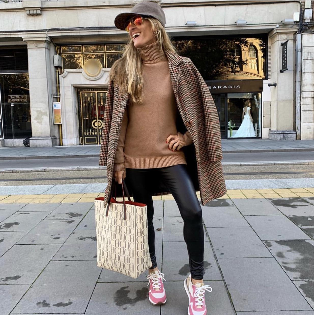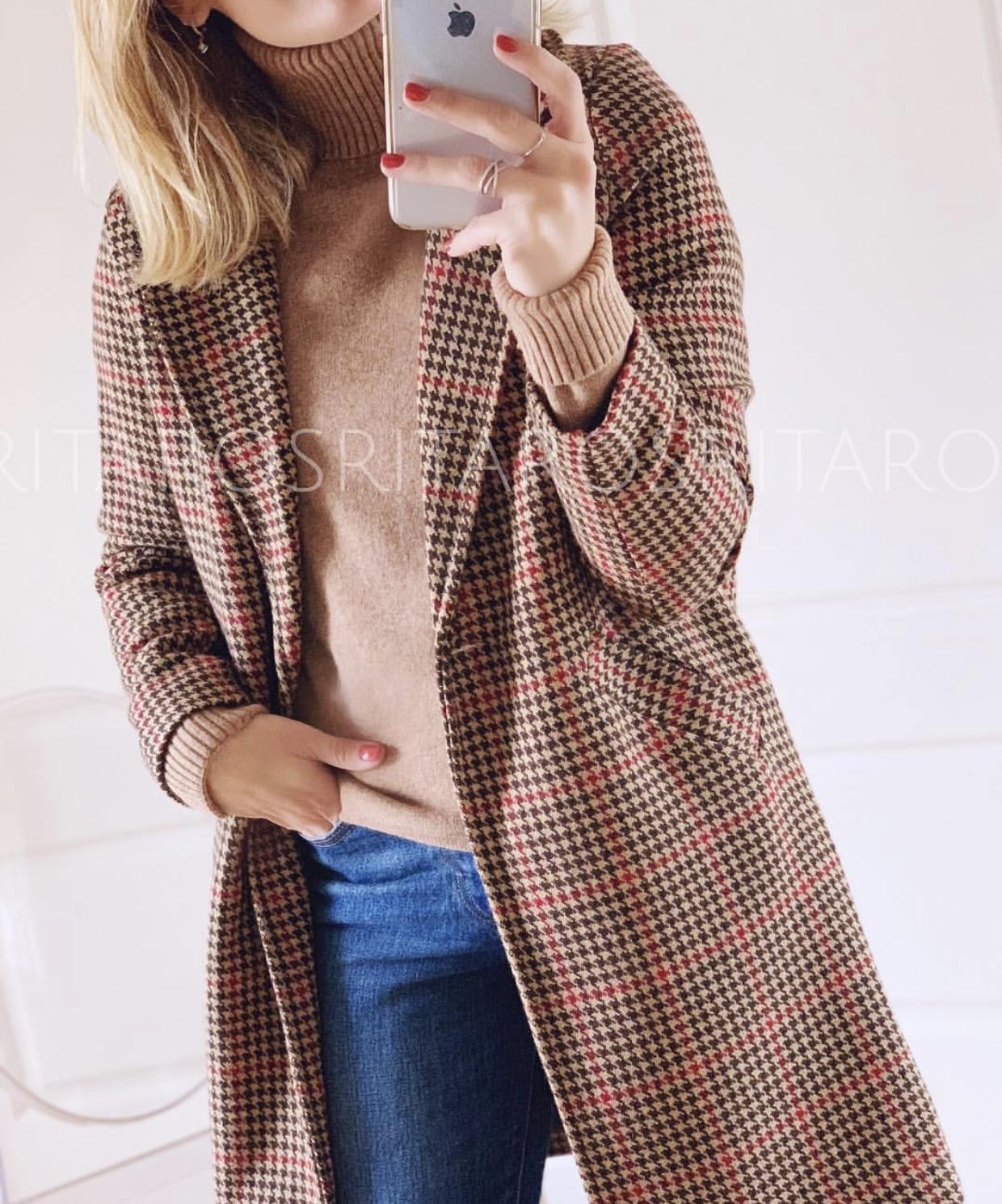 Jersey de punto de cuello alto y manga larga. Un básico ideal que hemos combinado con nuestro abrigo camel de cuadros.