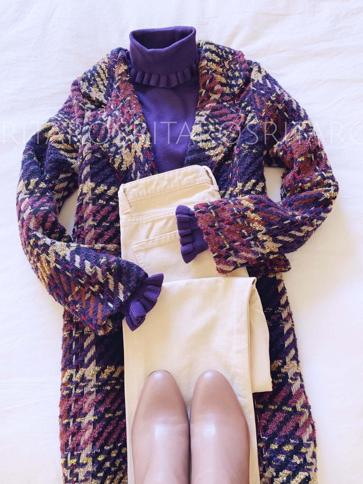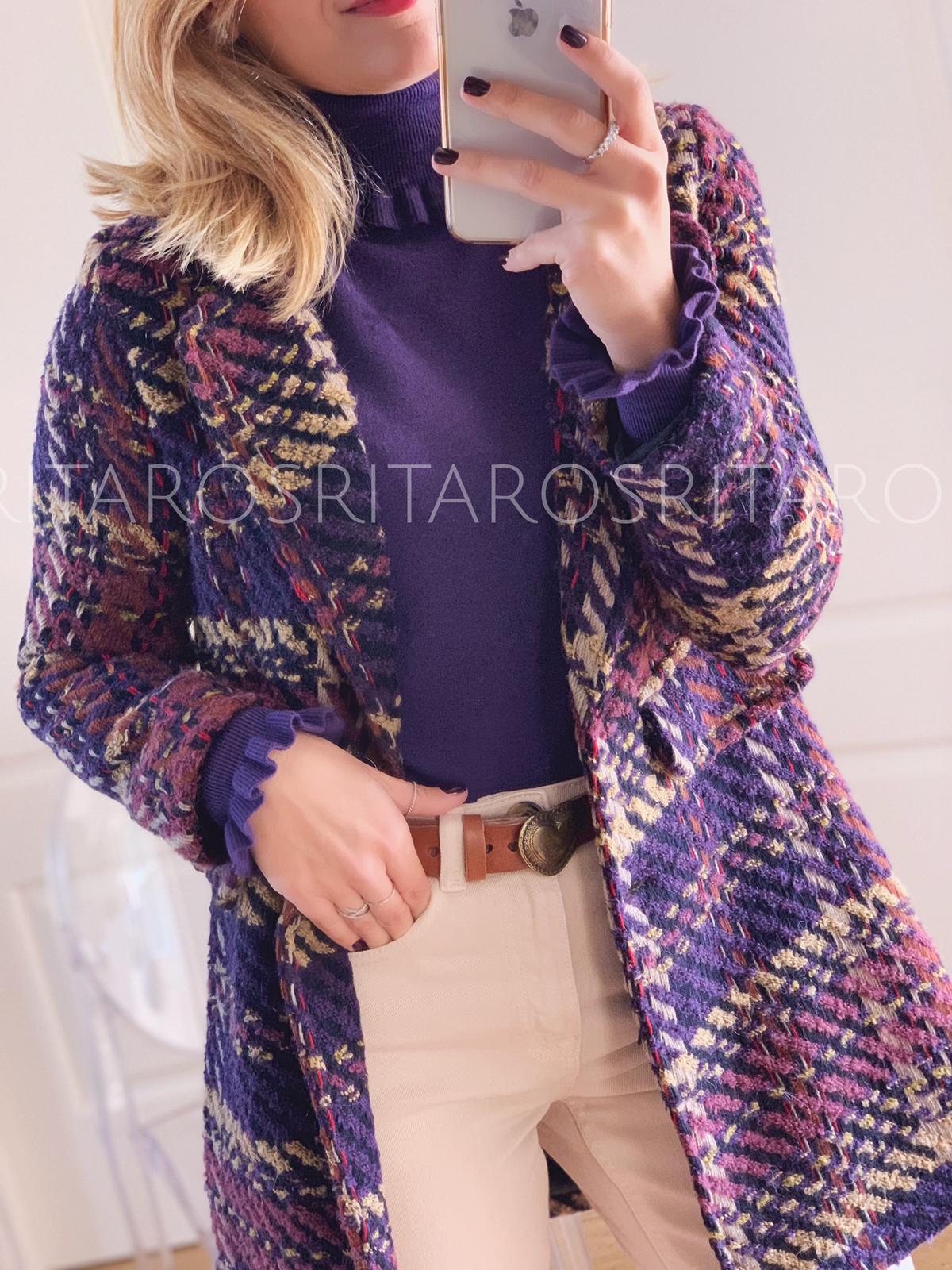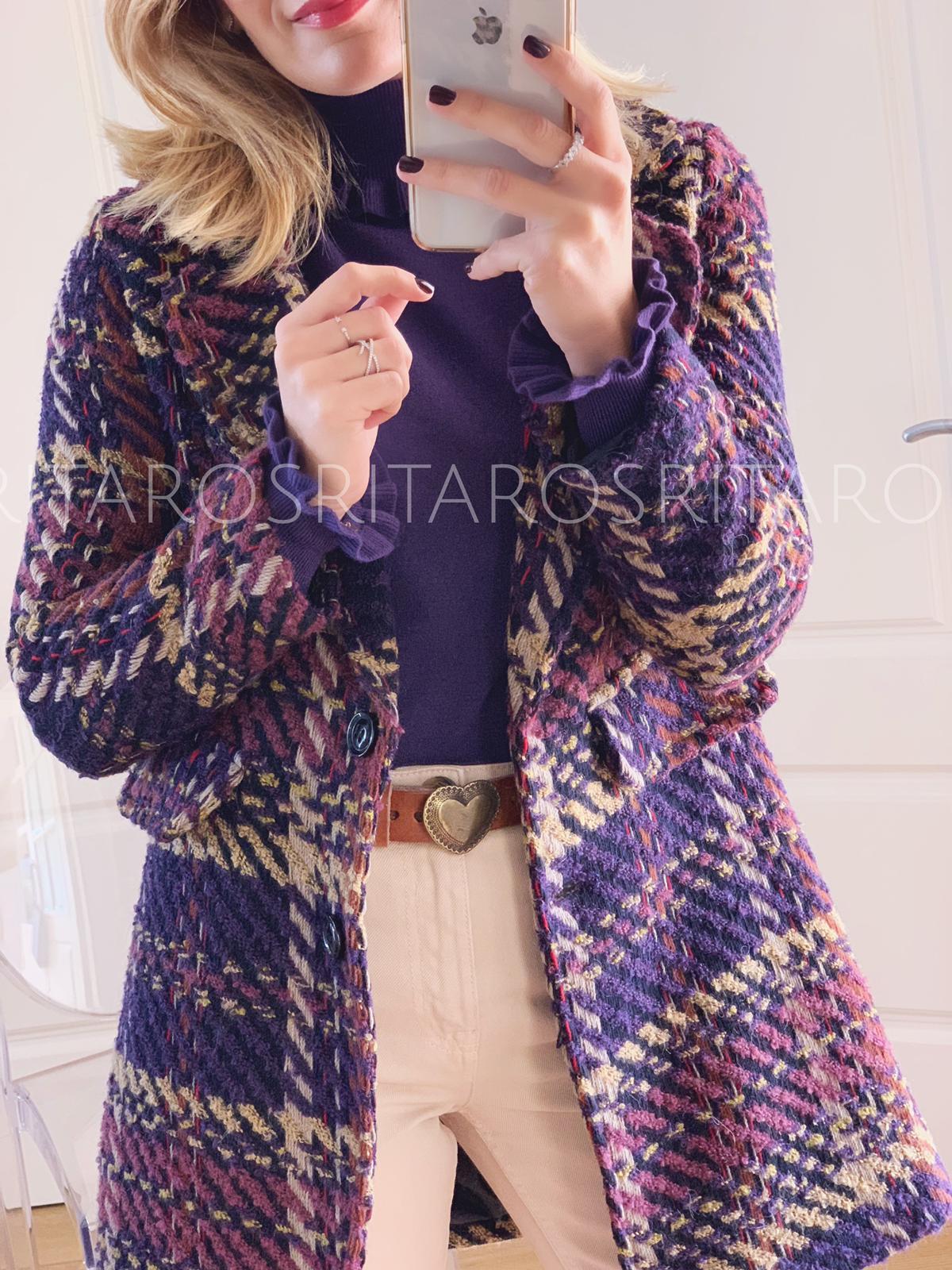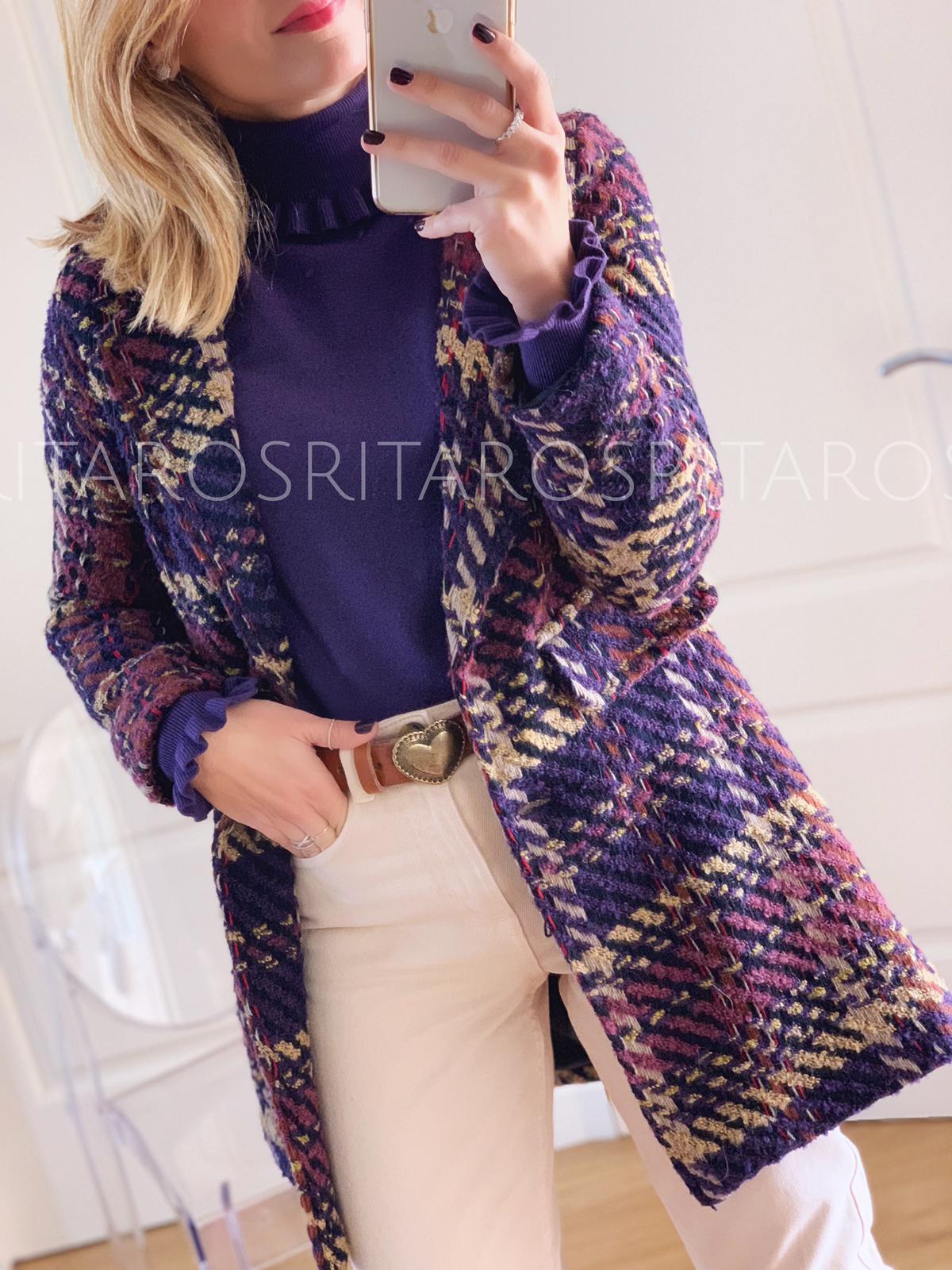 Abrigo de cuello y solapas, corte recto y manga larga estampado de cuadros. Combínalo con nuestro vestido de punto en lila y te encantará el resultado.