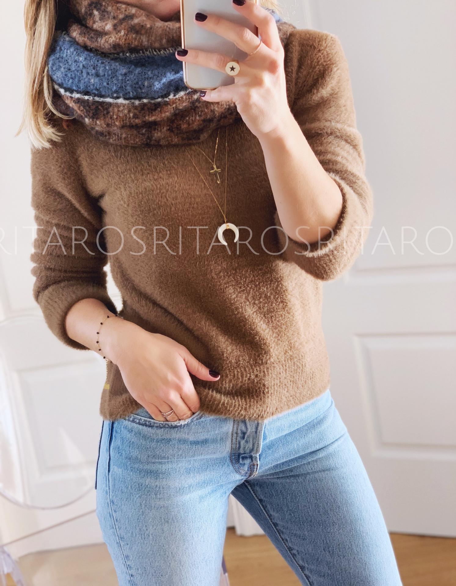Una maxibufanda súper suave en tonos camel y azul perfecta para los dias de frio para combinar con tus looks