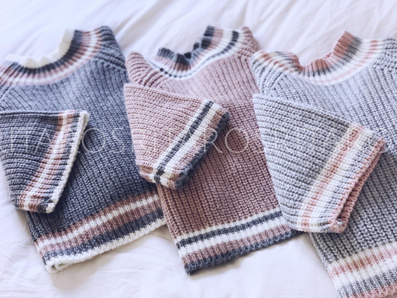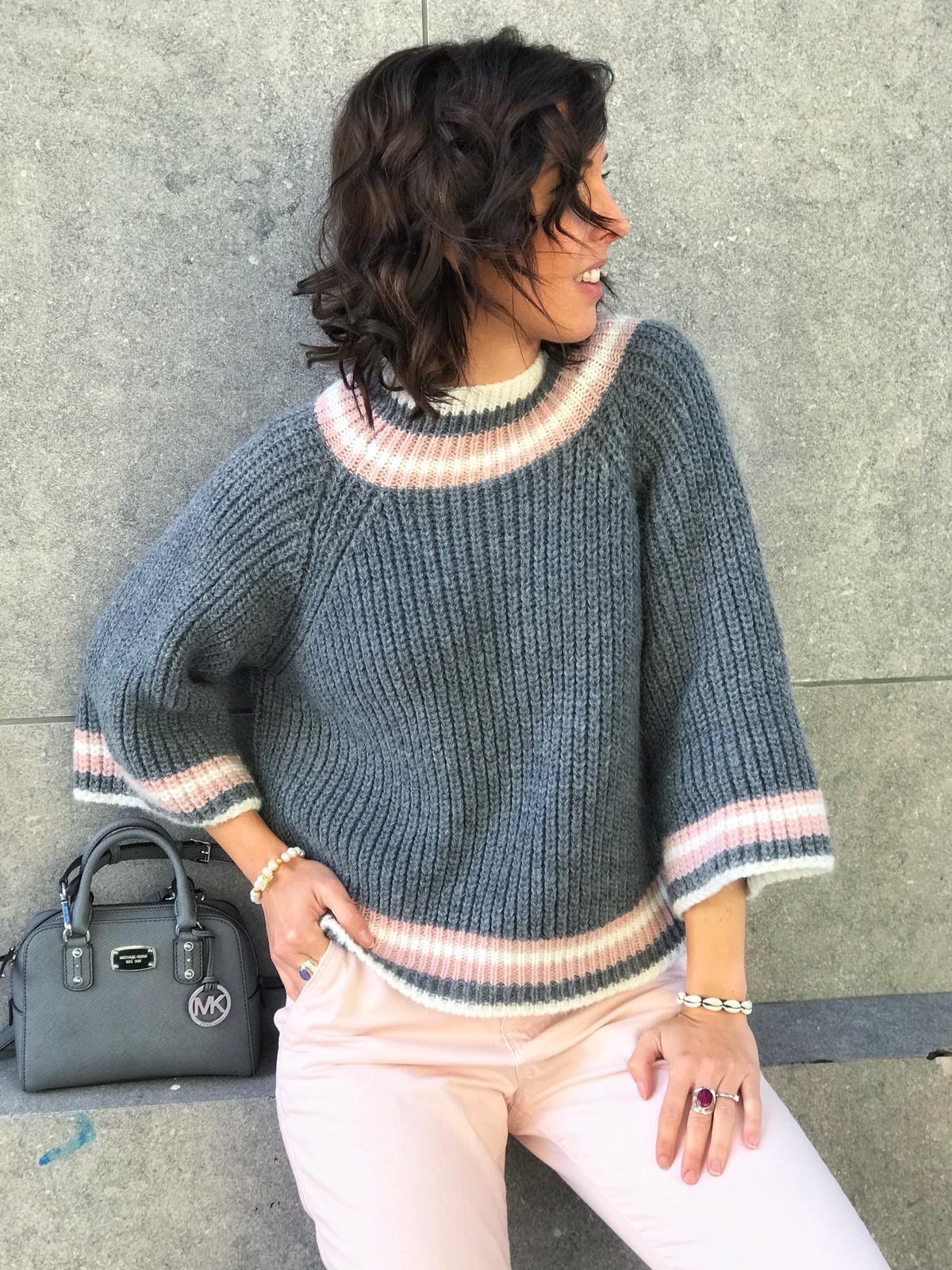 Jersey de punto grueso cuello subido y manga francesa con detalle cenefa en mangas, cuello y bajo. Un jersey precioso súper original.