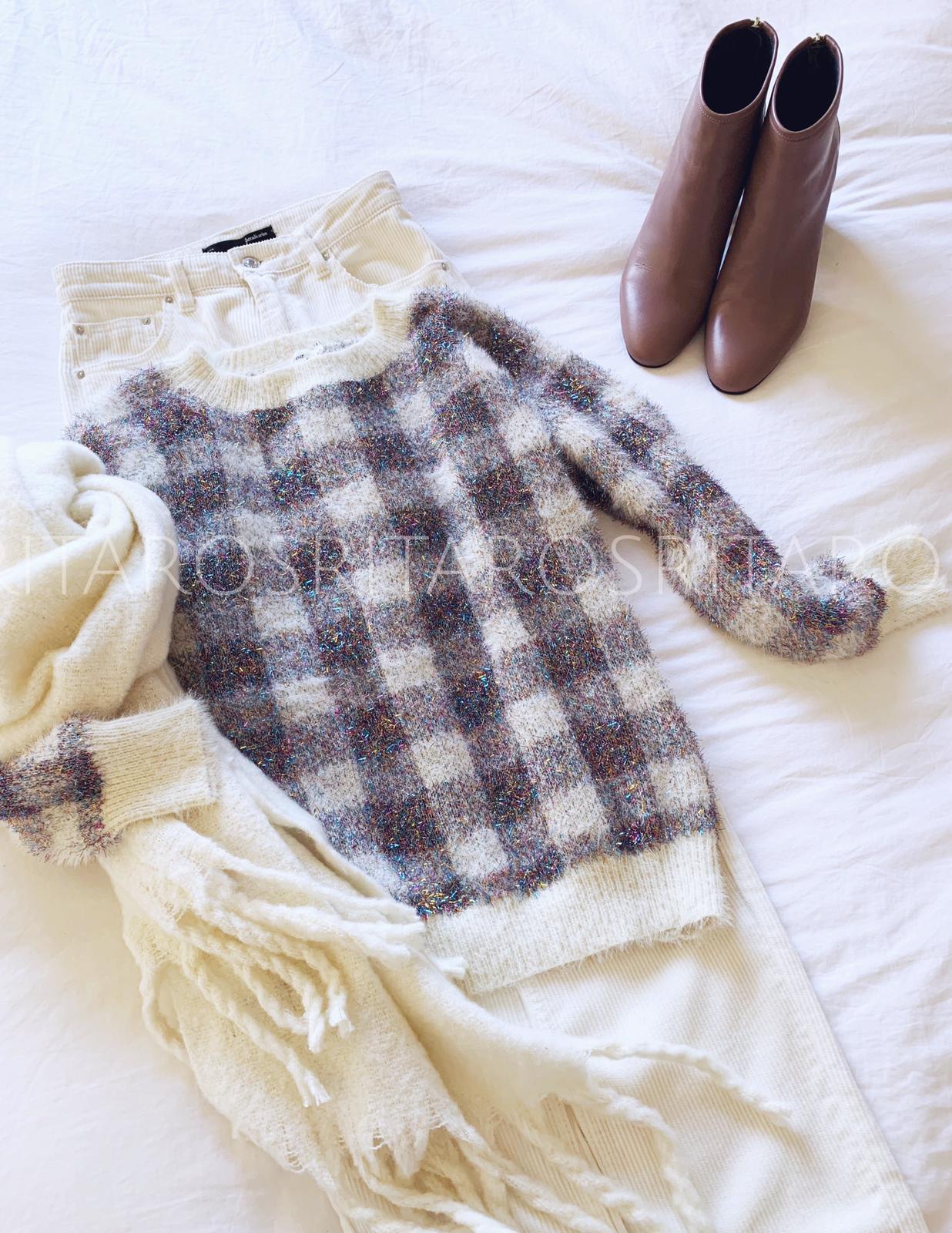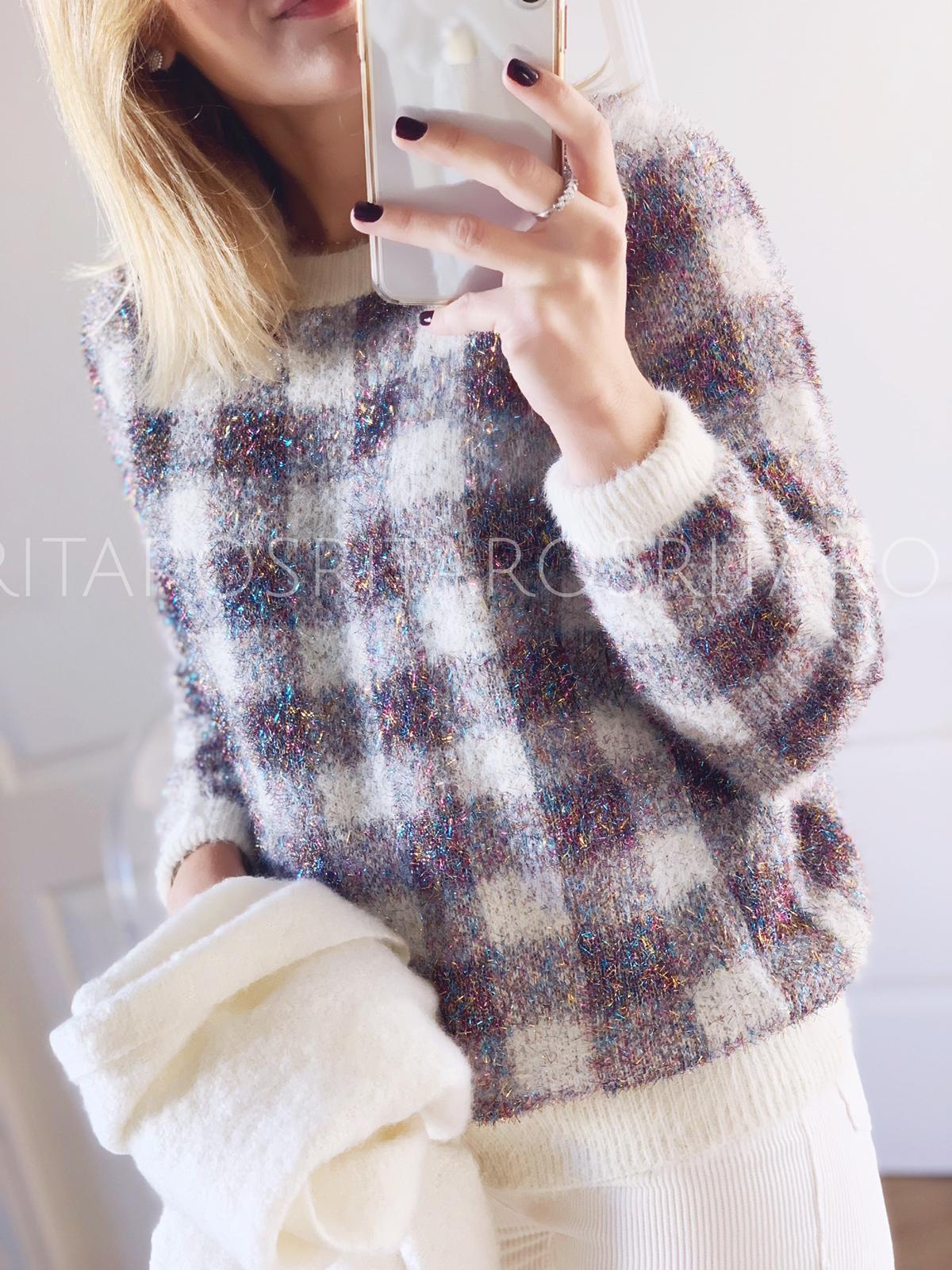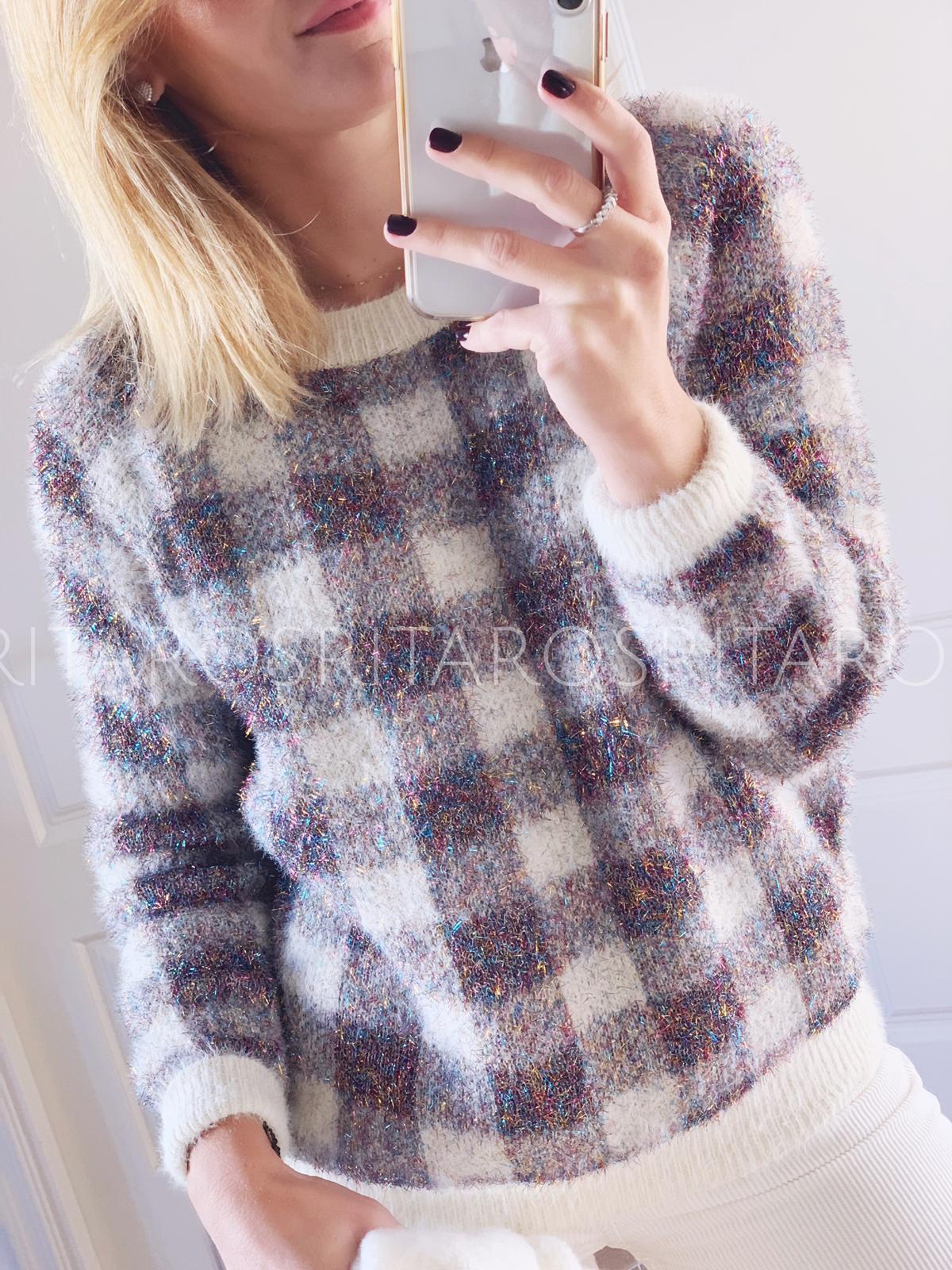 Precioso jersey de cuello redondo y manga larga estampado de cuadros con efecto Glitter. Una monada de jersey único y diferente.