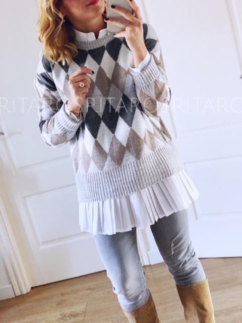 Una monada de Jersey en tonos grises perfecto para combinar con nuestra camisa plisada blanca y un pitillo en gris.