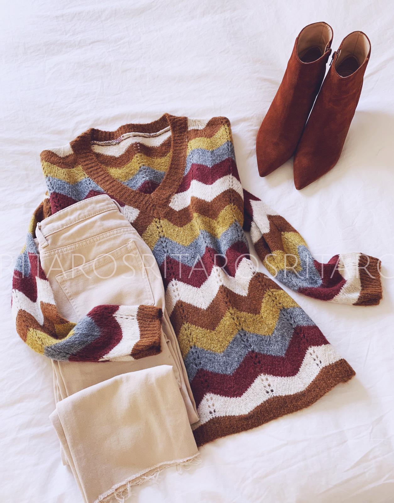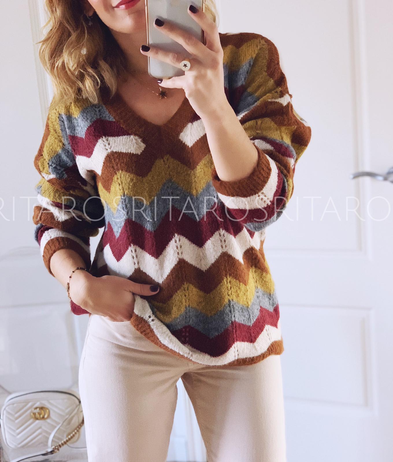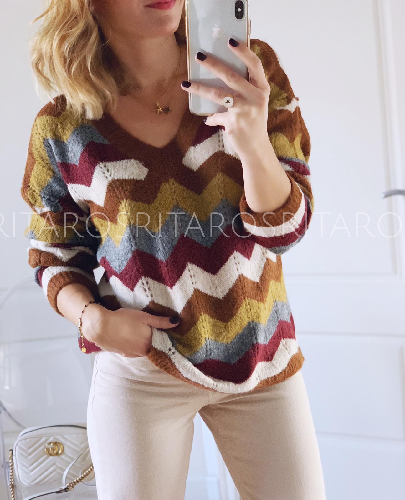 Jersey de punto, escote de pico y manga larga con un estampado precioso.