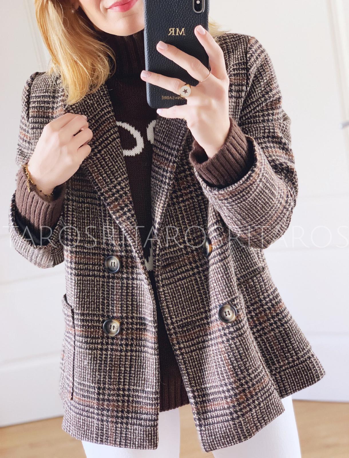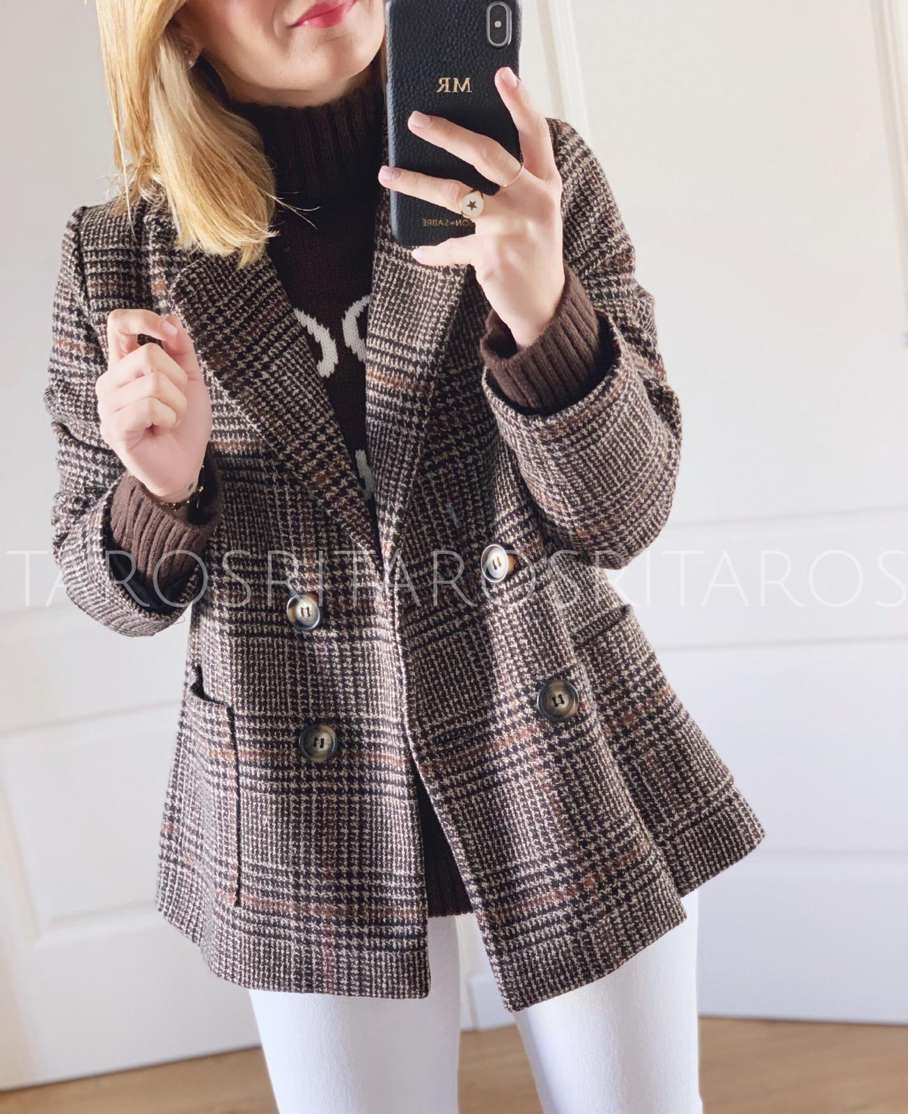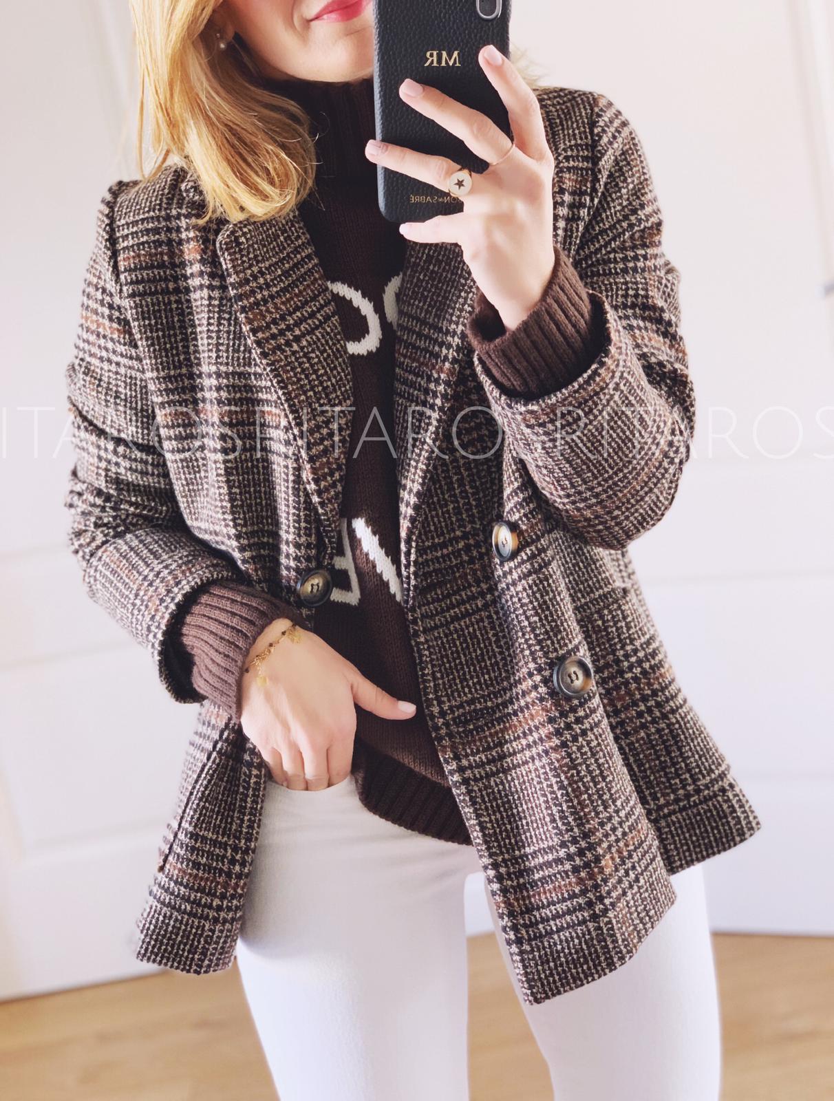 Chaquetón tipo oversize con cuello y solapa estampado de cuadros.