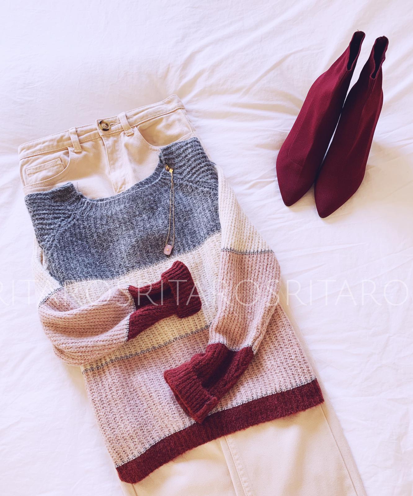 Una monada de jersey de punto, cuello redondo y manga larga con unos colores preciosos. Combínalo con unos jeans y unos botines y el look es perfecto.