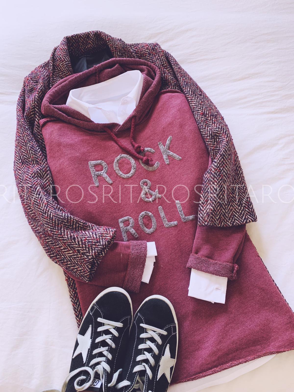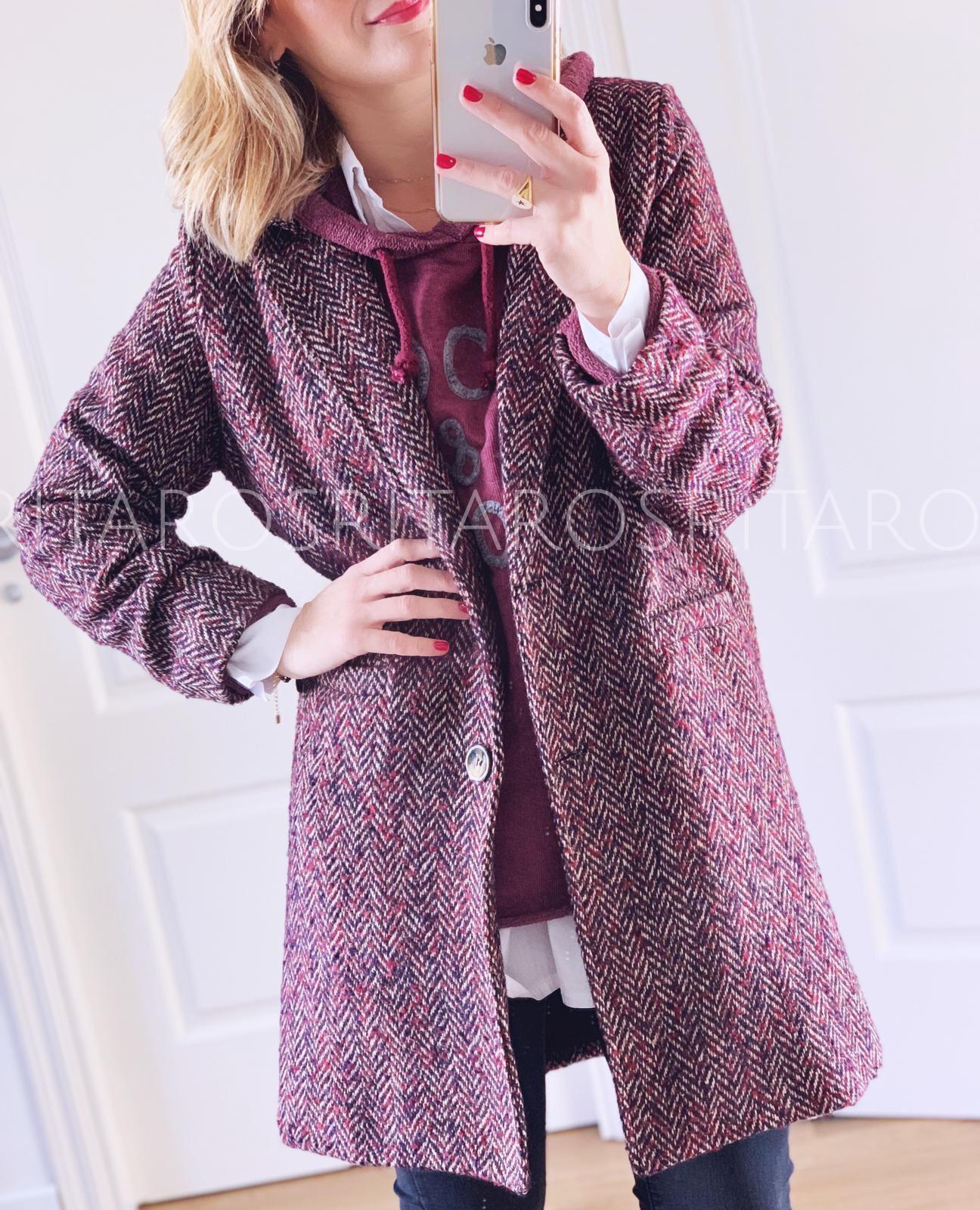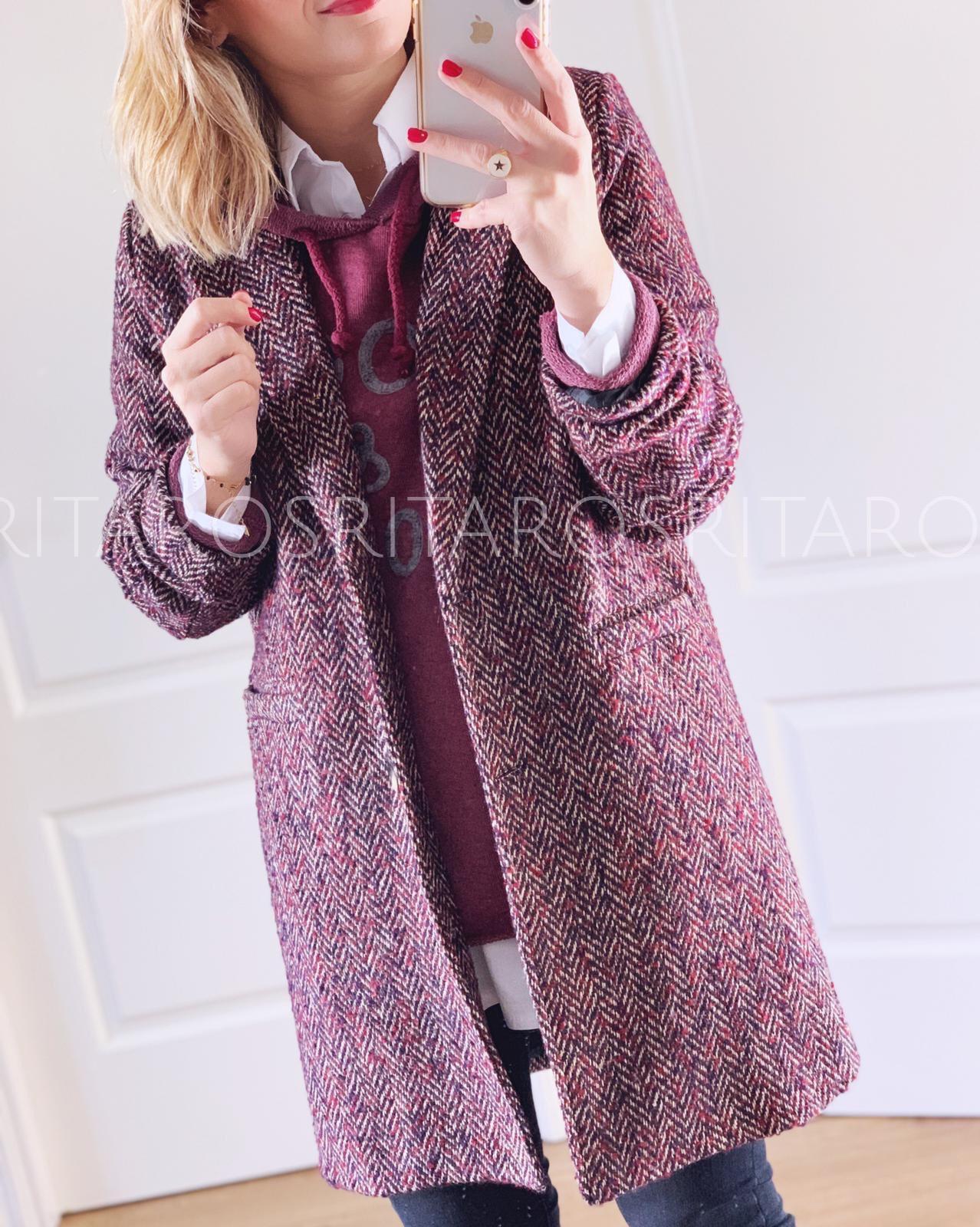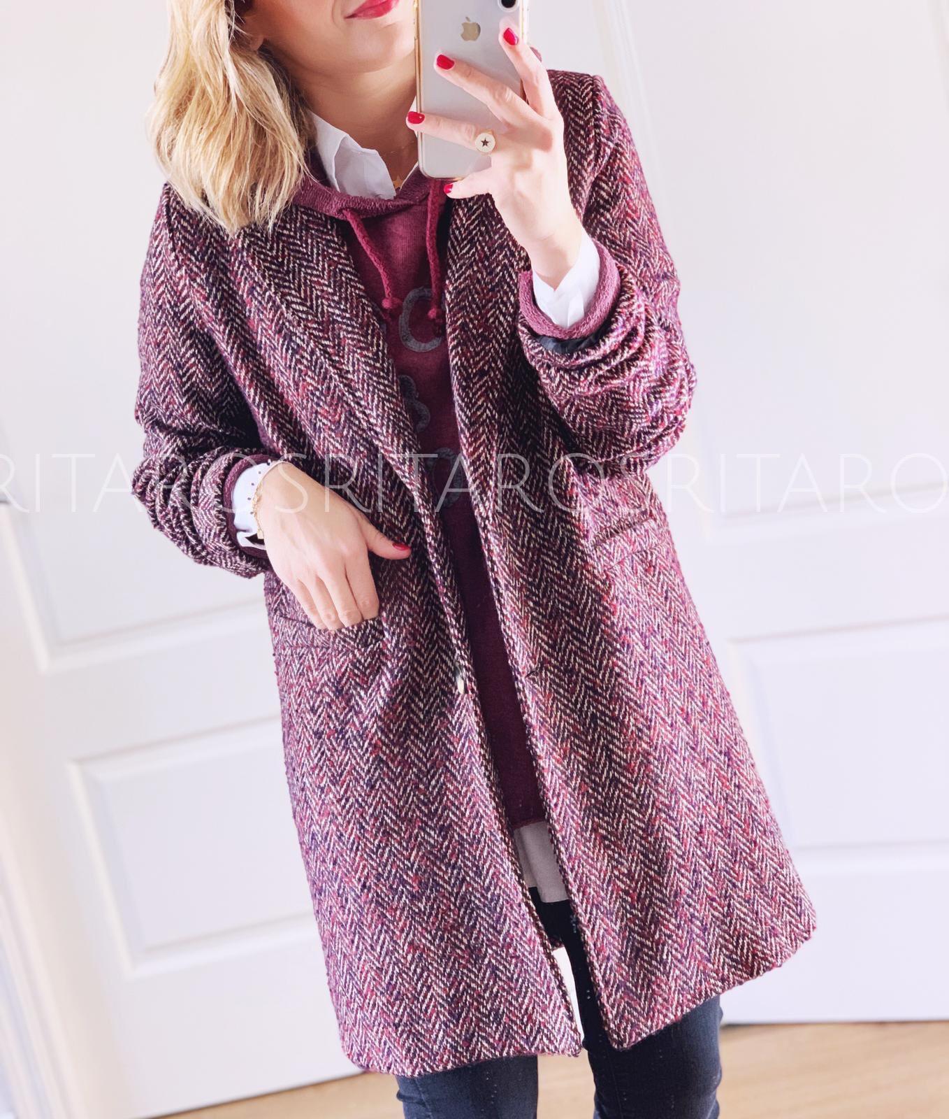 Abrigo de cuello y solapas, corte recto y de tejido tipo jaspeado. Combínalo con nuestra sudadera en color granate y te encantará el resultado.