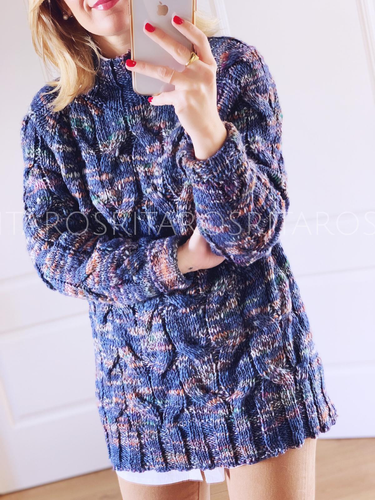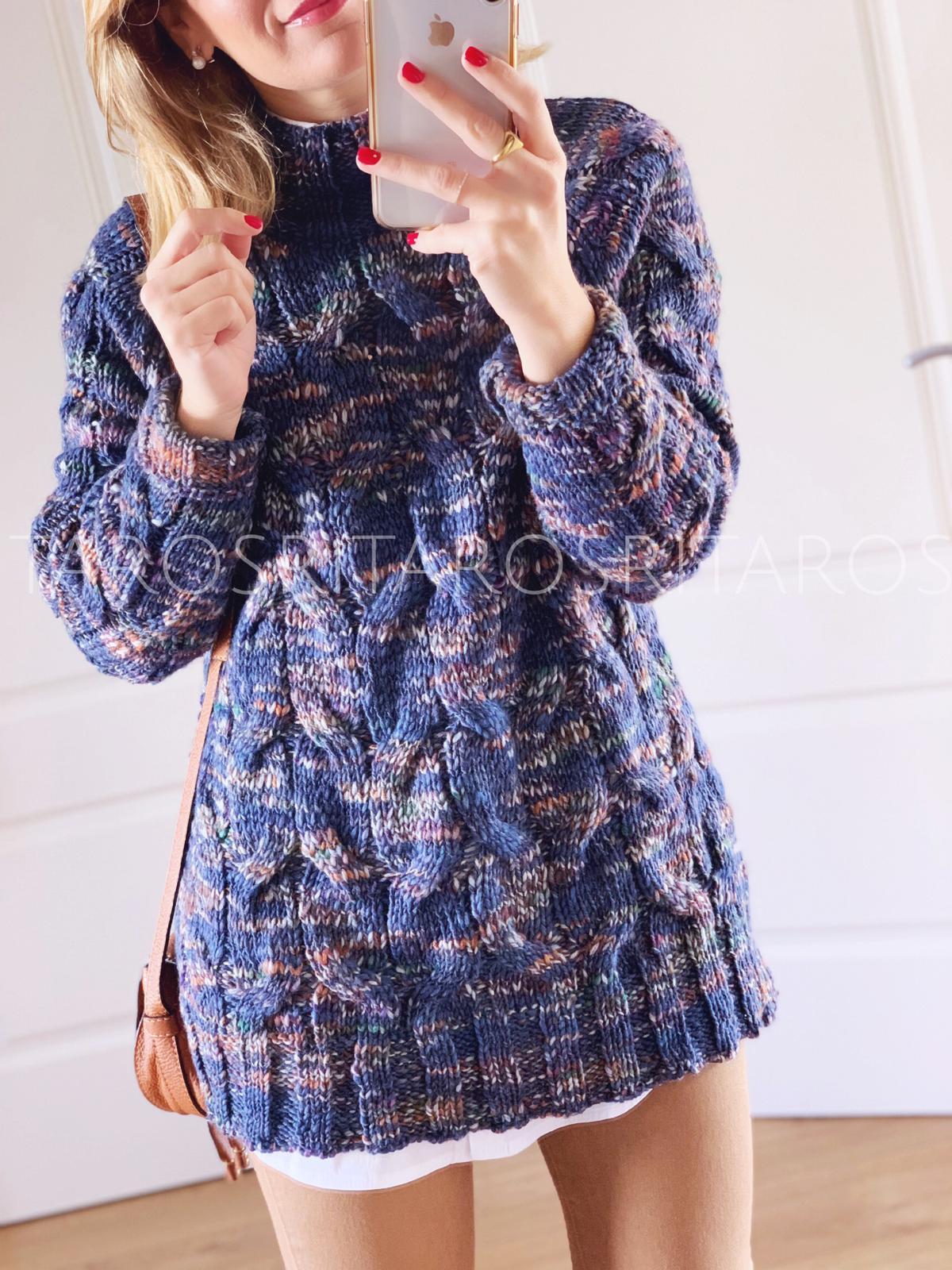 Jersey de punto cuello subido y manga larga con un estampado precioso. Combínalo con nuestro pantalón André en color camel y nuestra camisa maxilarga y te encantará el resultado.