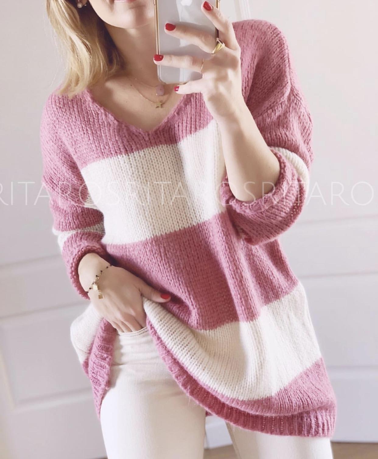 Precioso jersey de punto con cuello de pico y manga larga estampado de rayas.