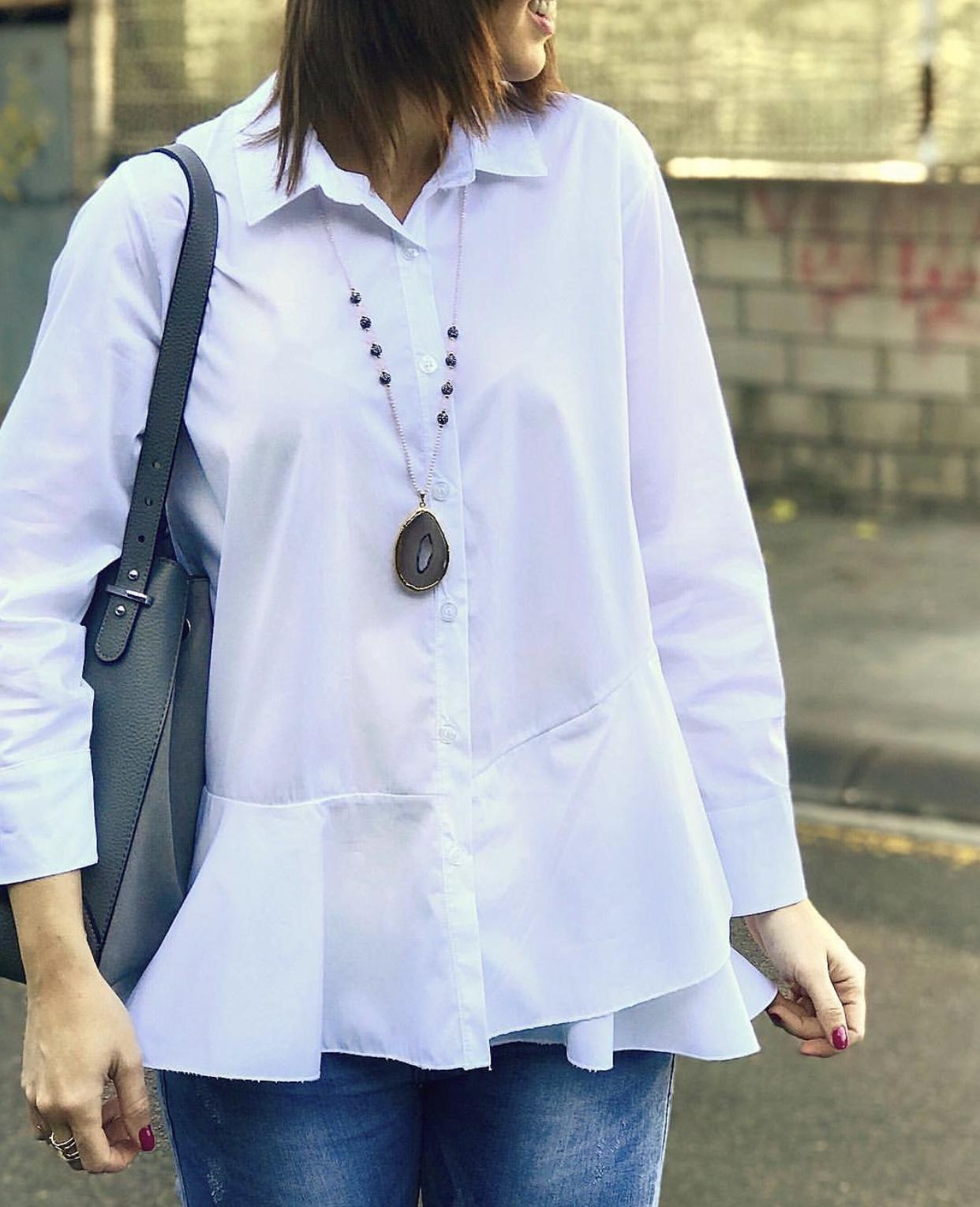 Camisa de manga larga y cuello de camisa con volante en el bajo y precioso detalle buho de pelito y lentejuelas en la espalda.