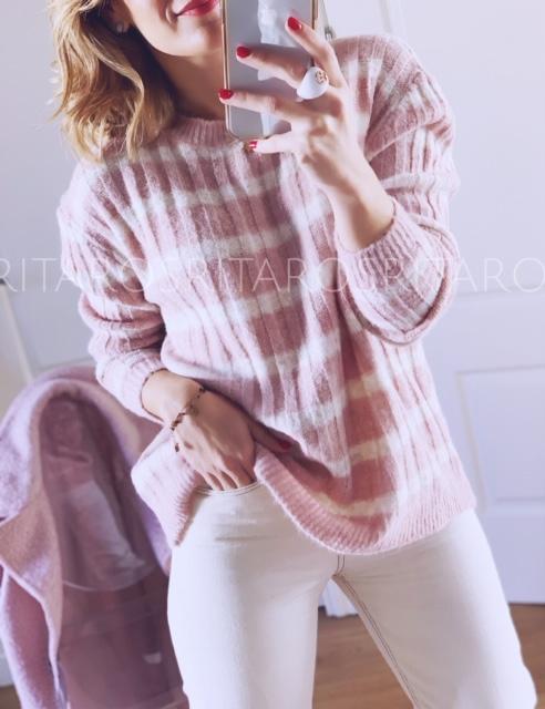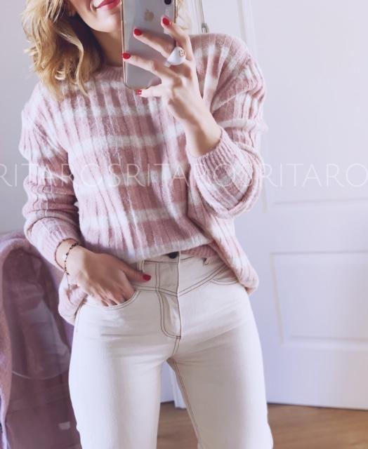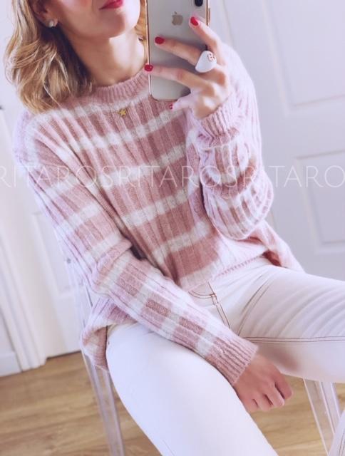 Jersey de cuello redondo y manga larga estampado de rayas. Combínalo con nuestro abrigo Rouse del mismo tono y la combinación te encantará.