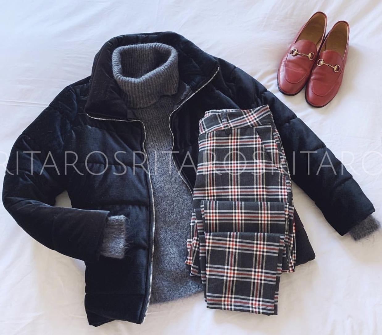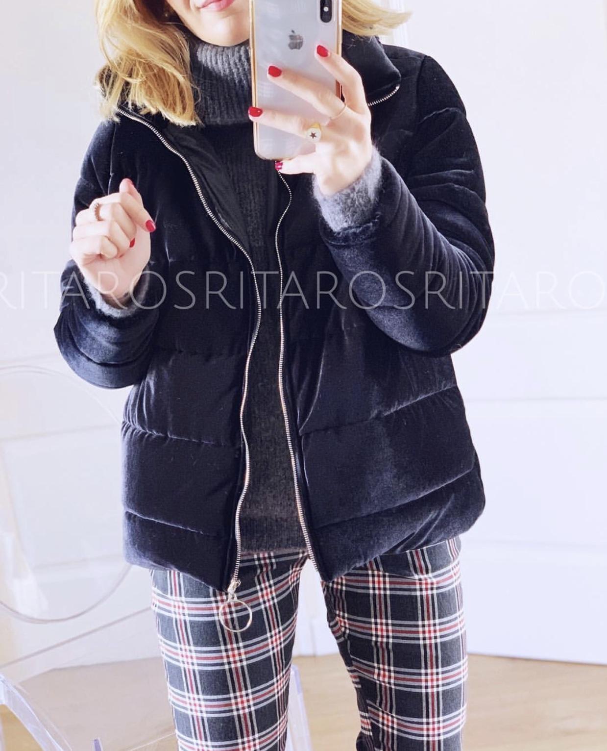 Plumón acolchado de terciopelo con cuello subido y cerrado con cremallera.