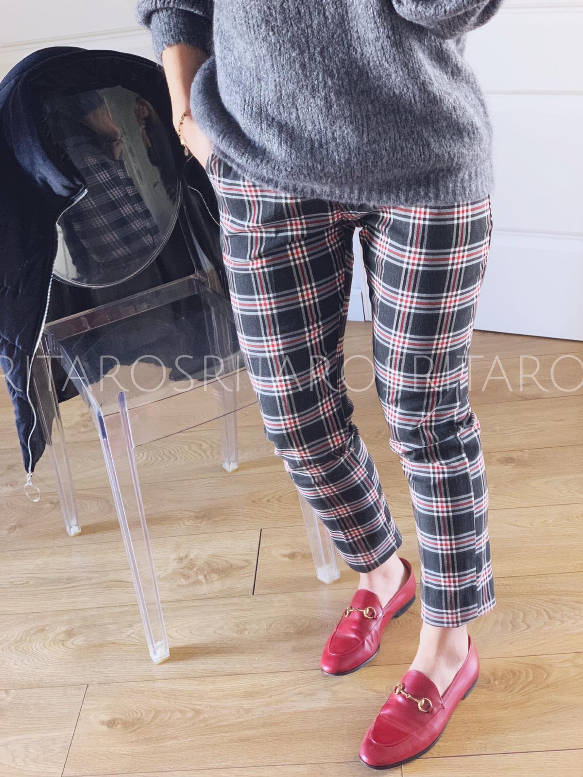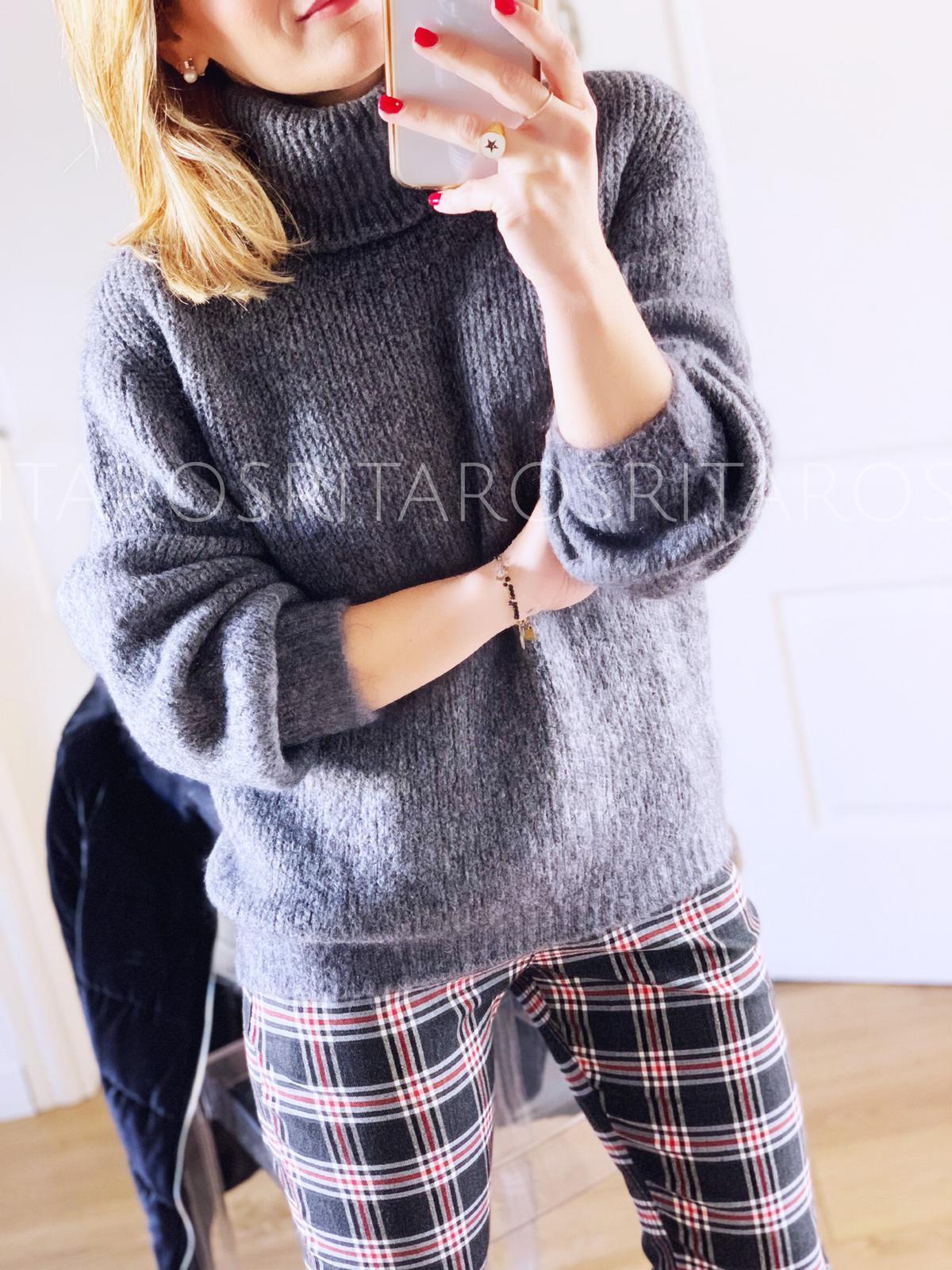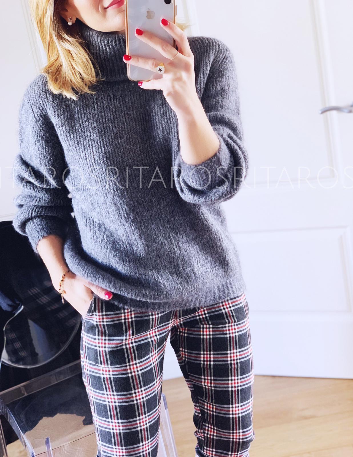 Pantalón pitillo elástico estampado de cuadros. Lo hemos combinado con nuestro plumón de terciopelo en color negro y nuestro Jersey Rita en Gris y la combinación es perfecta.