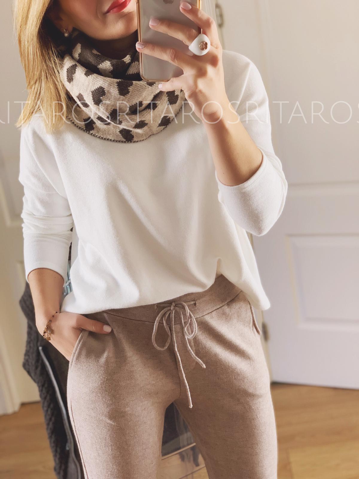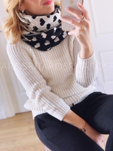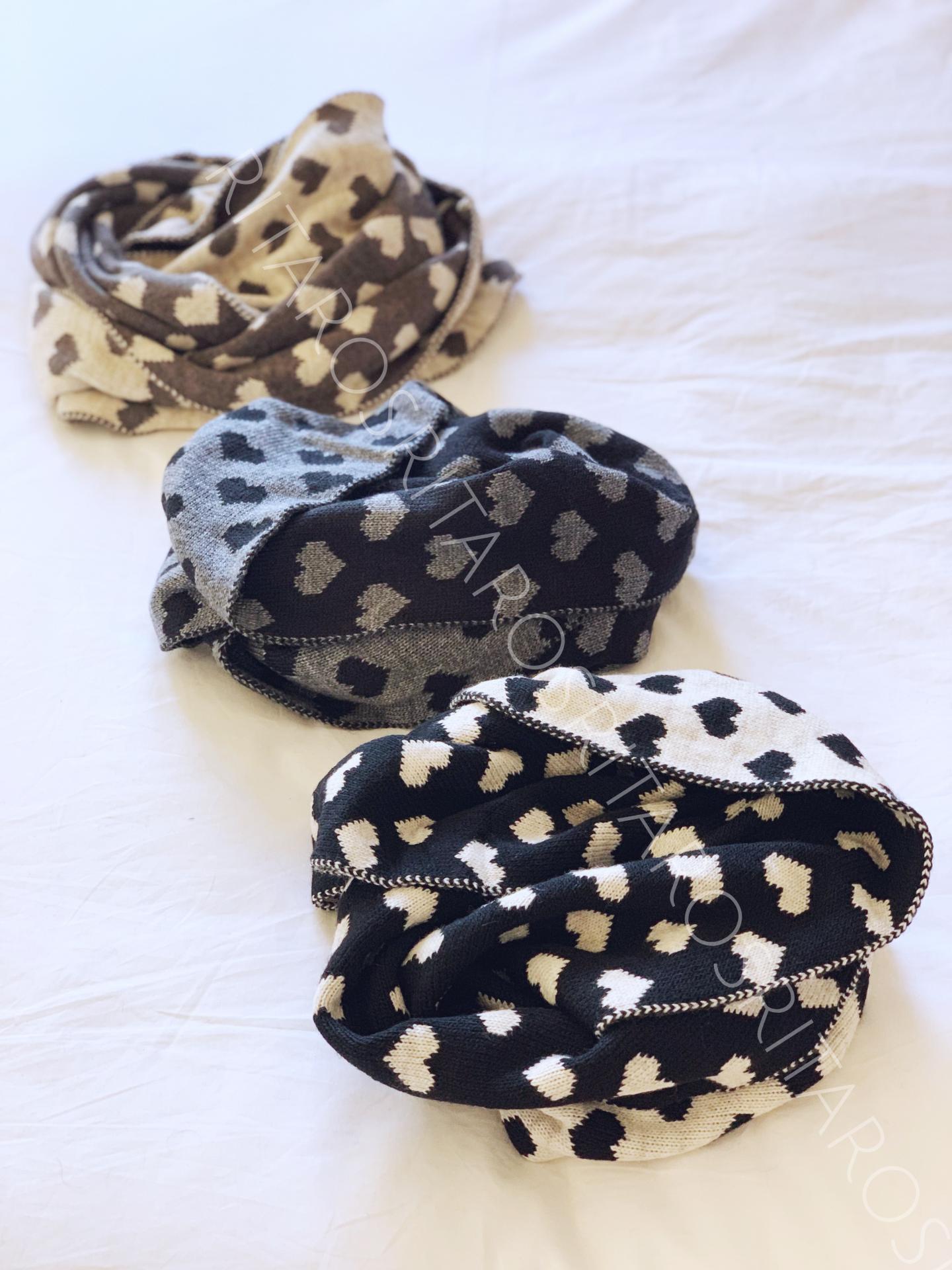 Bufanda estampada de corazones. Combínala con nuestra trenka en color marrón chocolate y nuestro pantalón París en beige y te encantará el resultado.
