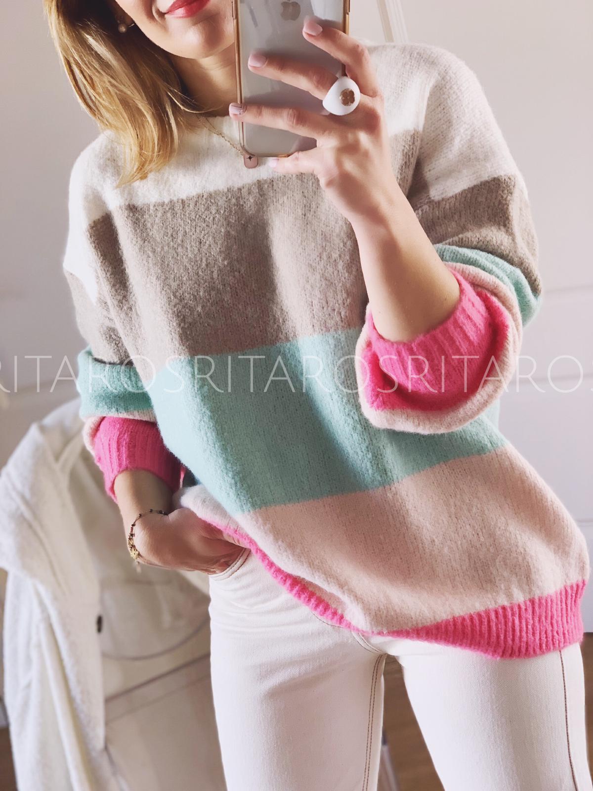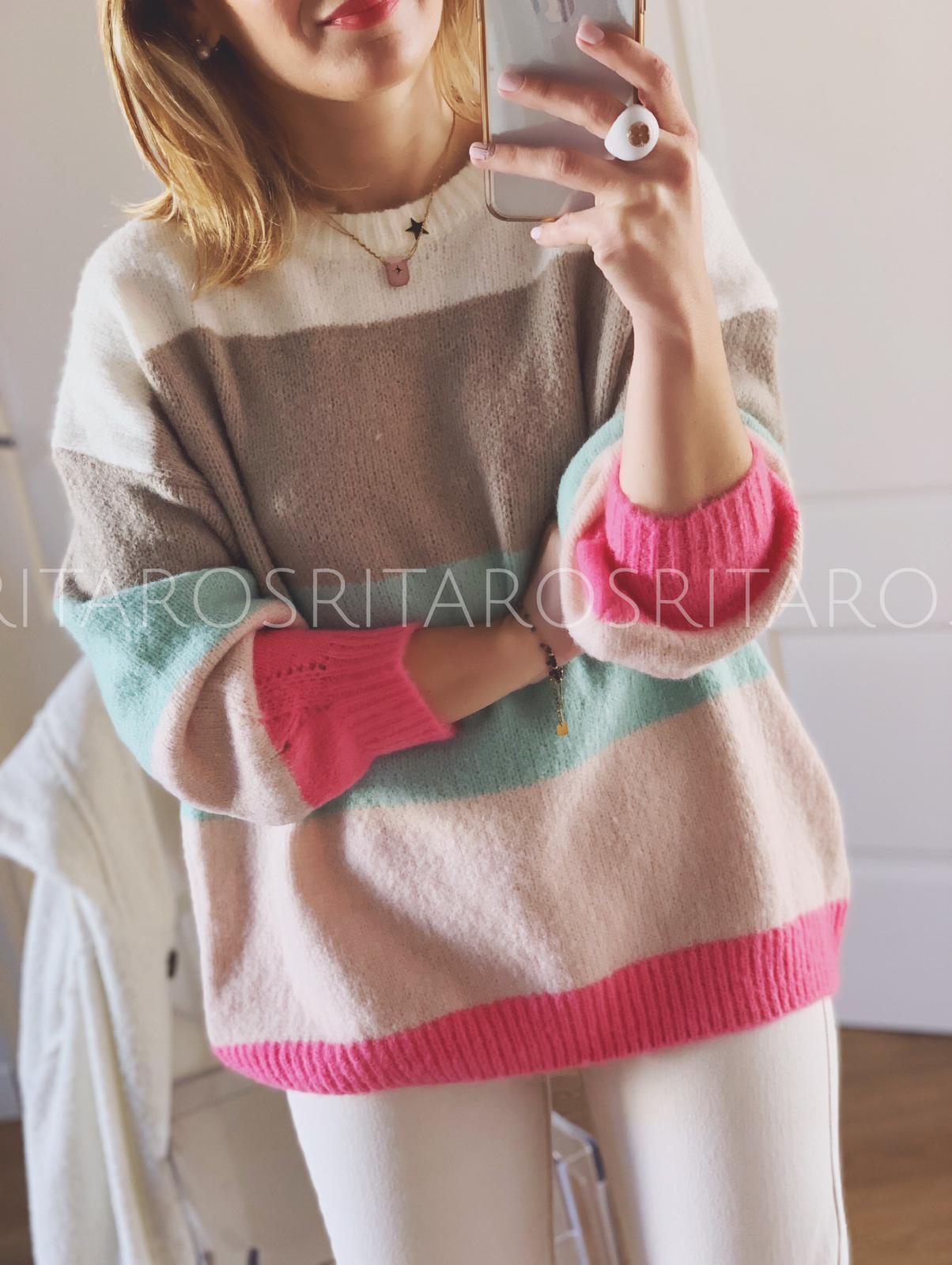 Precioso jersey de punto cuello redondo y manga larga estampado de rayas con unos colores preciosos.