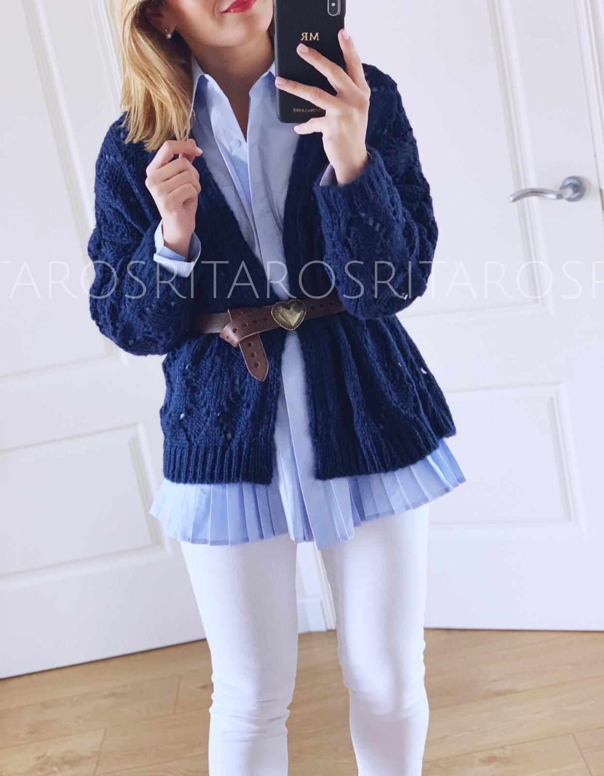 Monada de chaqueta de punto troquelado en tono beige que hemos combinado con nuestra camisa plisada en azul cielo.