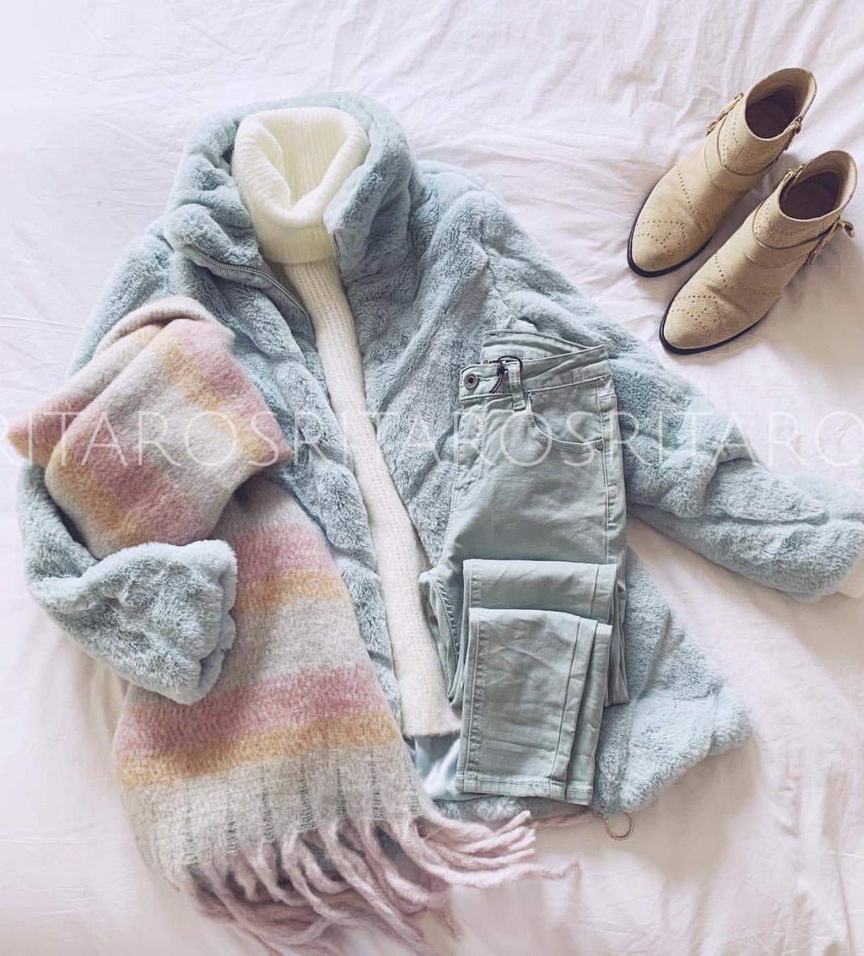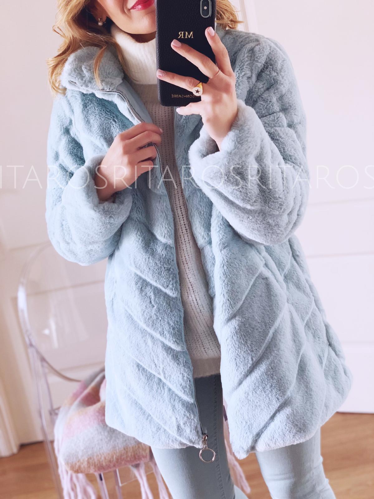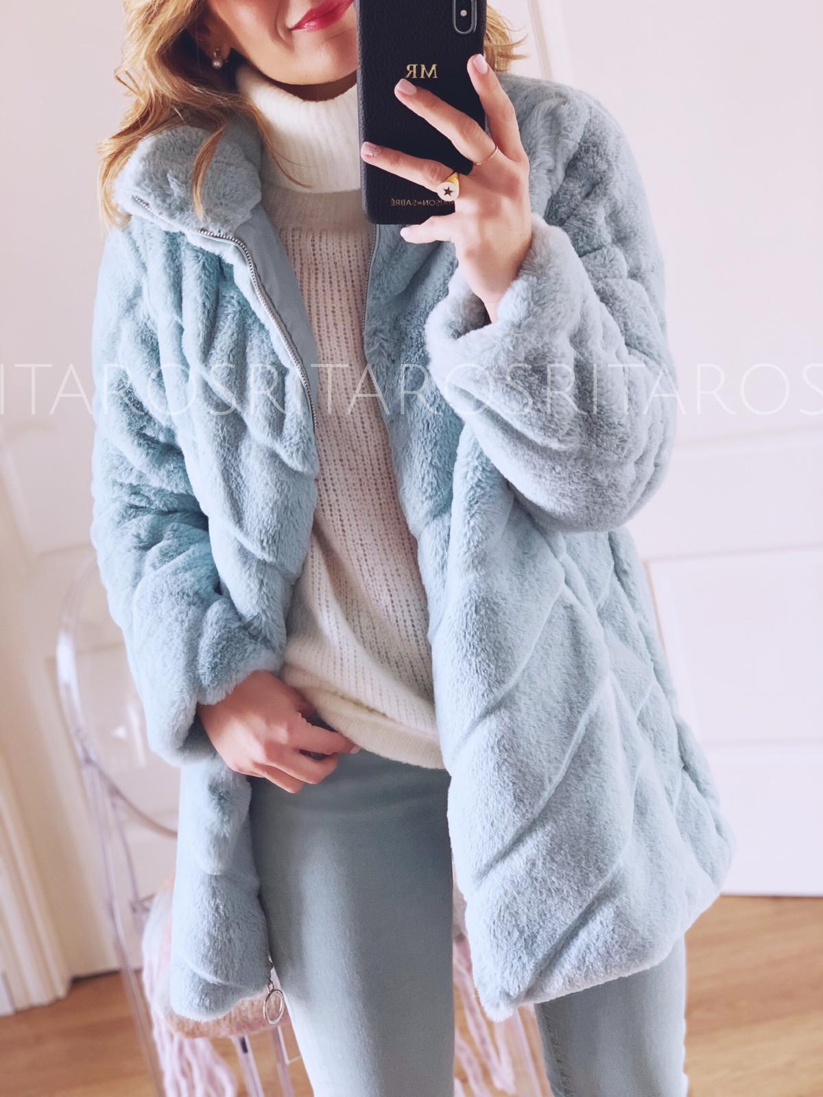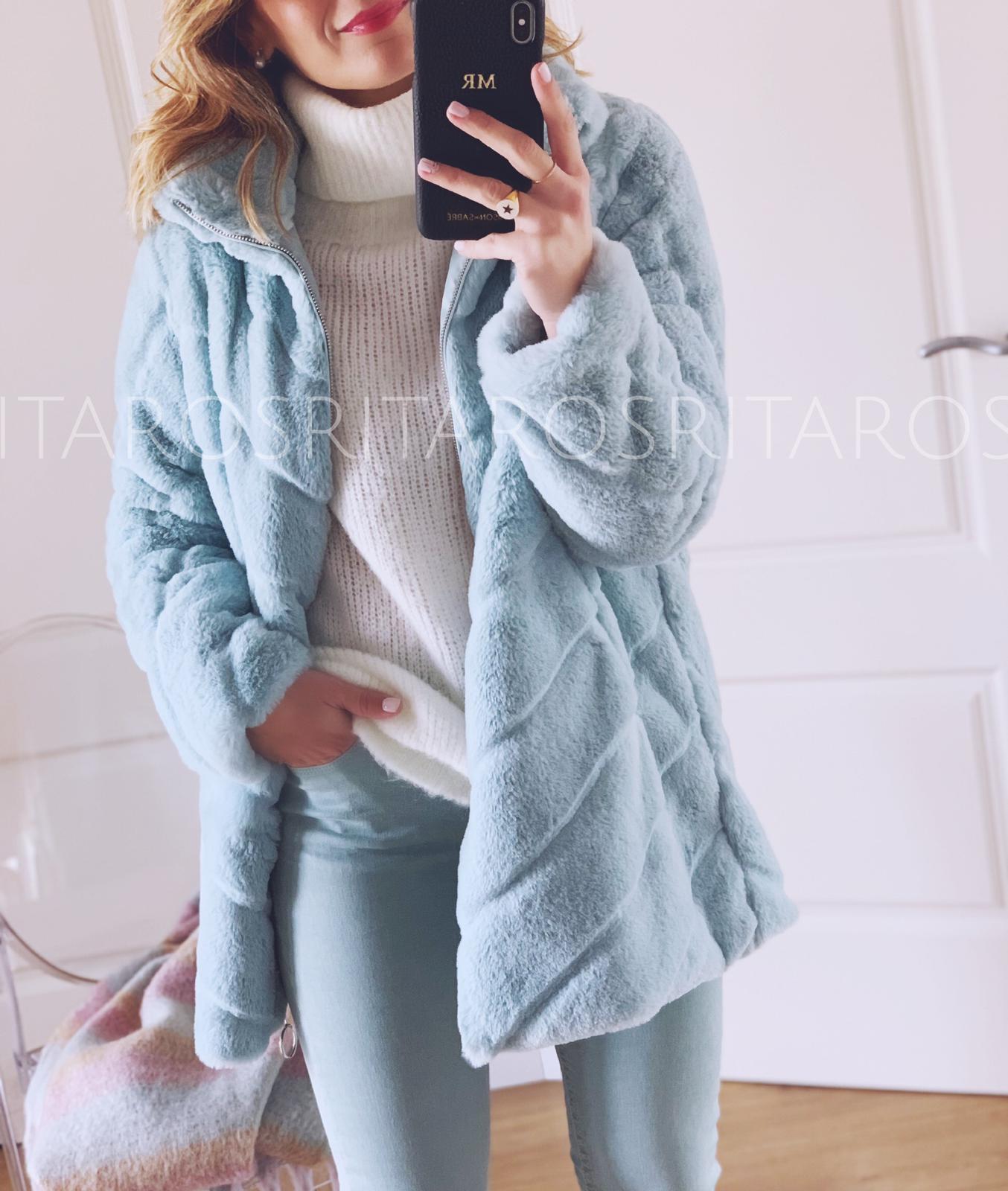 Precioso abrigo de pelito con cuello subido y manga larga, cerrado con cremallera. Combínalo con nuestro pantalón Stelle verde agua y nuestro jersey Rita en blanco y te encantará el resultado.