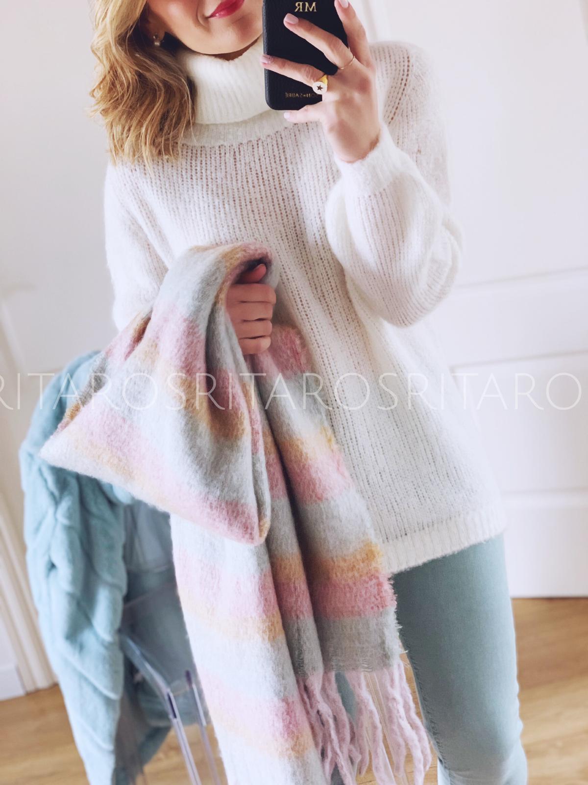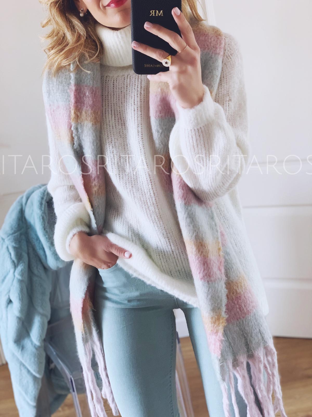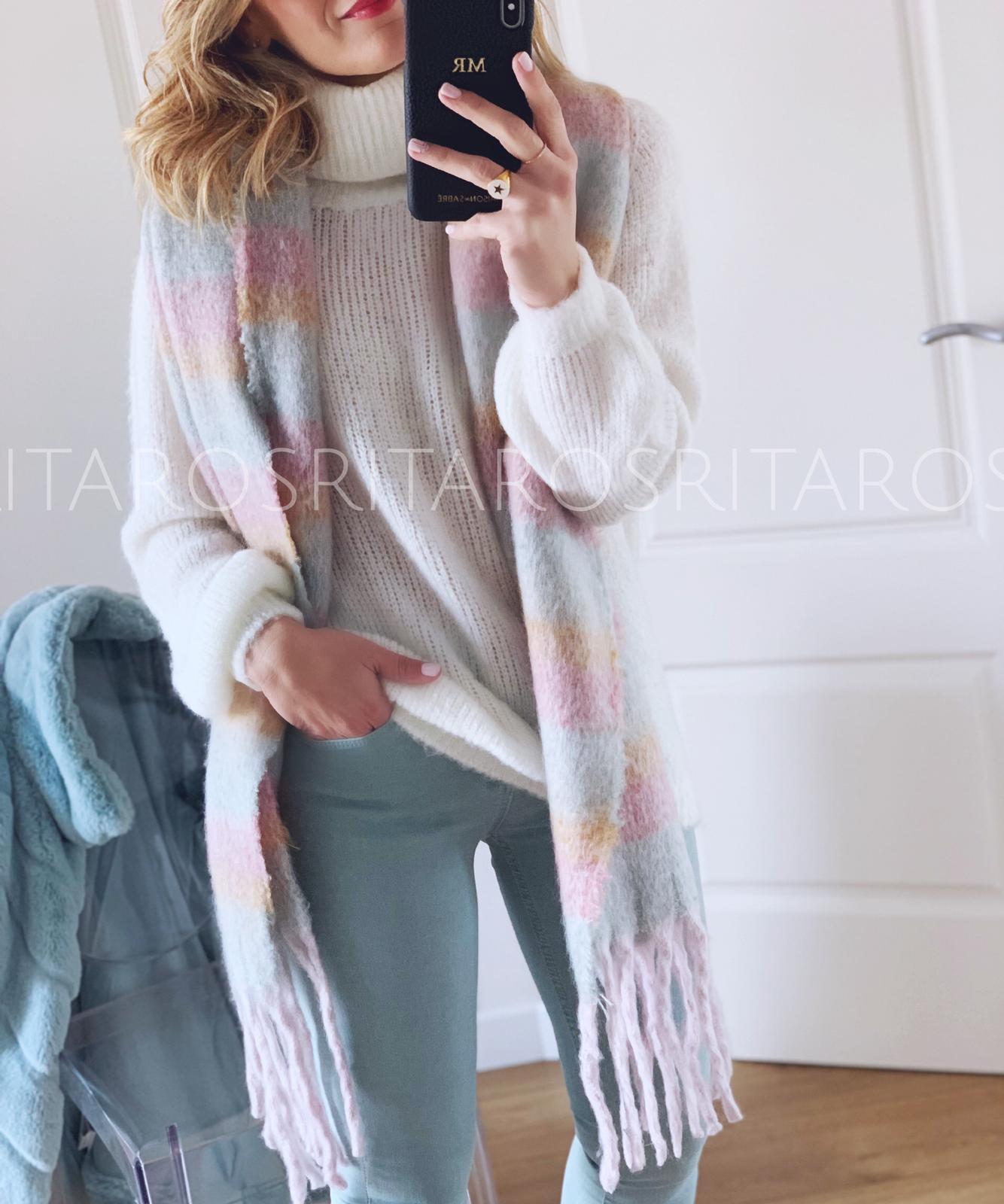 Una bufanda ideal para completar tus outfits de invierno. Combínala con nuestro abrigo Stelle, pantalón Stelle y Jersey RIta en blanco y te encantará el resultado.