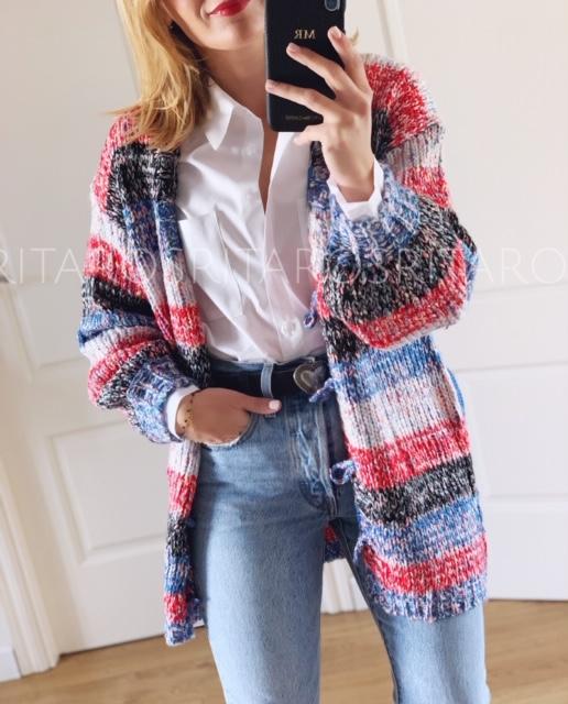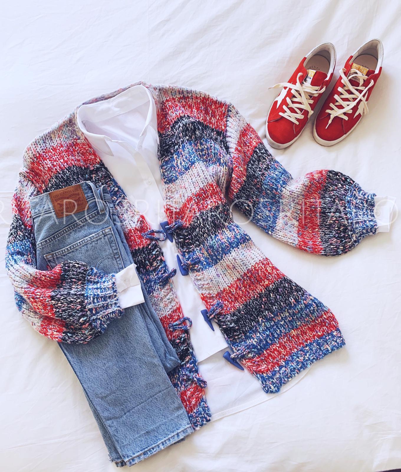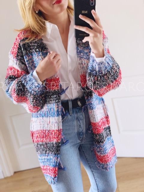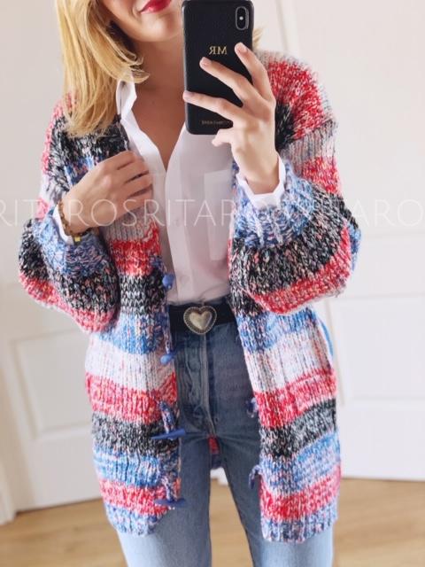 Una monada de chaqueta de punto tipo trenka jaspeada de colores y cerrada con trabillas.